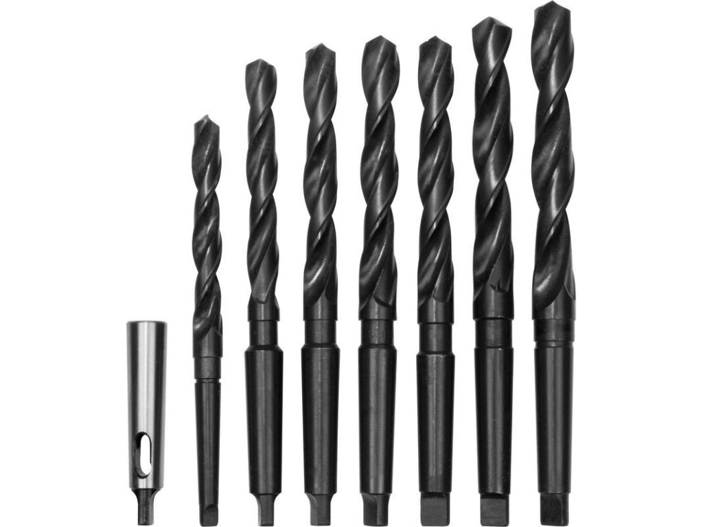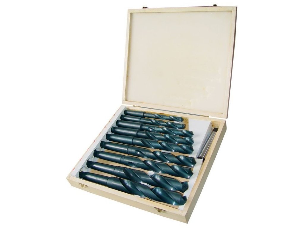Vrtáky na vŕtanie do ocele, legovanej/nelegovanej liatej ocele, oceľovej liatiny, liatiny, farebných kovov (mosadz, bronz) a podobne. Z rýchloreznej ocele, s MK upínaním. Redukcia MK1-MK2. V drevenom boxe.