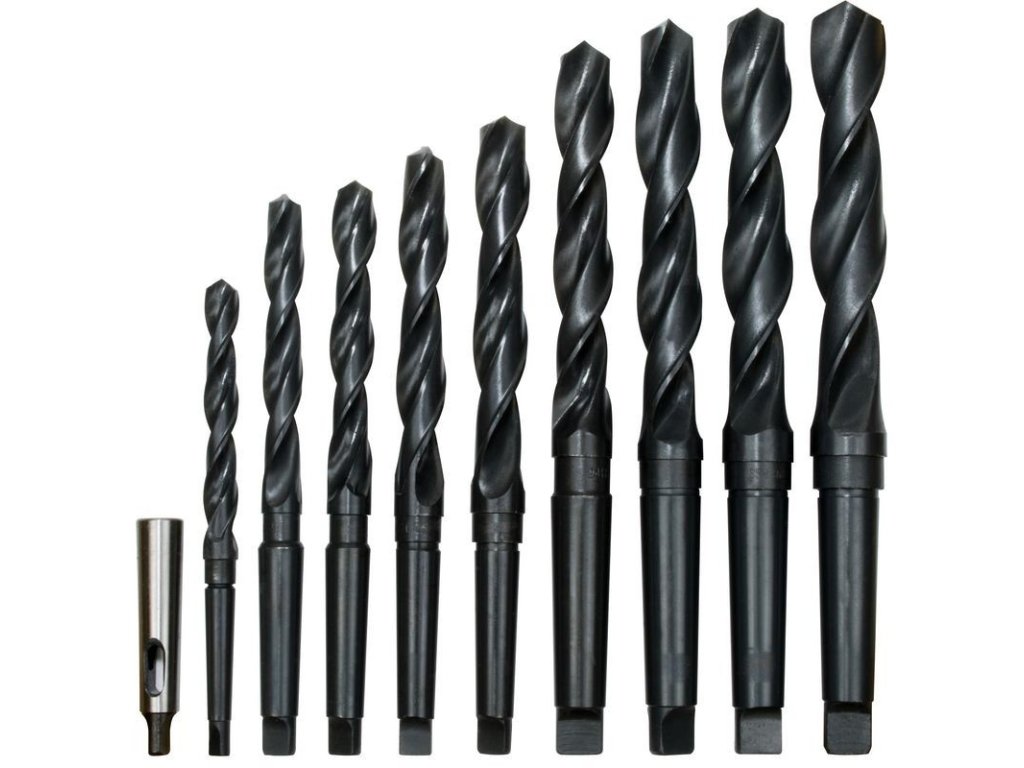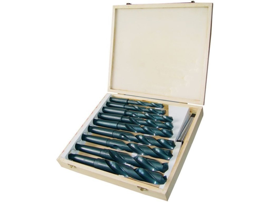 Vrtáky na vŕtanie do ocele, legovanej/nelegovanej liatej ocele, oceľovej liatiny, liatiny, farebných kovov (mosadz, bronz) a podobne. Z rýchloreznej ocele, s MK upínaním. Redukcia MK1-MK2. V drevenom boxe.