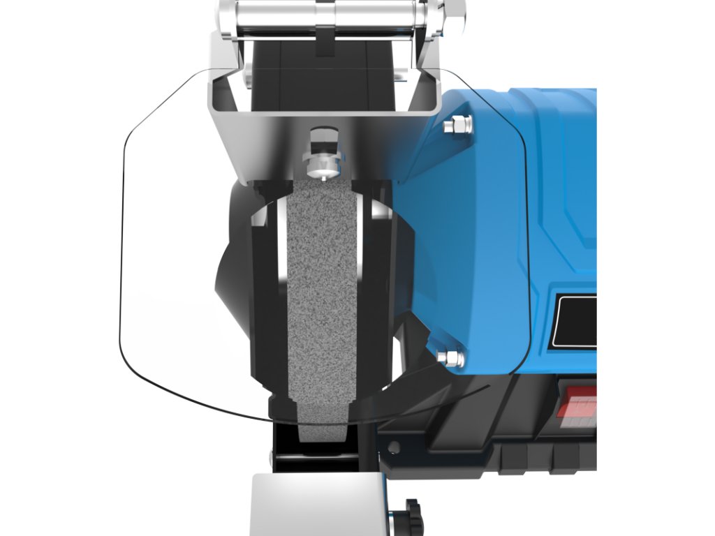 Stolová dvojkotúčová brúska s ochrannými krytmi proti iskrám s možnosťou nastavenia, stabilná základňa, osi uložené v guľôčkových ložiskách, kondenzátorový motor, chod bez vibrácií. Polohovateľné pracovné opierky, brúsny kotúč na hrubé a jemné brúsenie s adaptérom 16 mm.