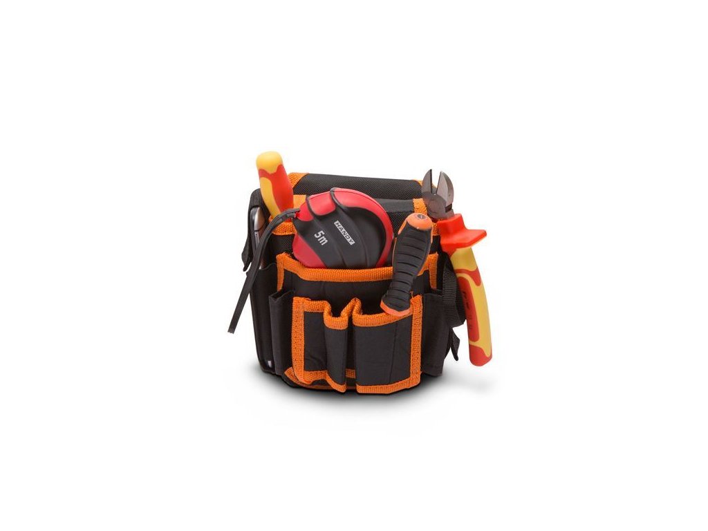 Mimoriadne praktická taška na náradie určená na zavesenie na opasok, vyrobená z pevného polyesterového materiálu. Vrecká rôznych tvarov a veľkostí pre uloženie rôznych typov náradia. Pevný suchý zips, upevnenie na opasok.