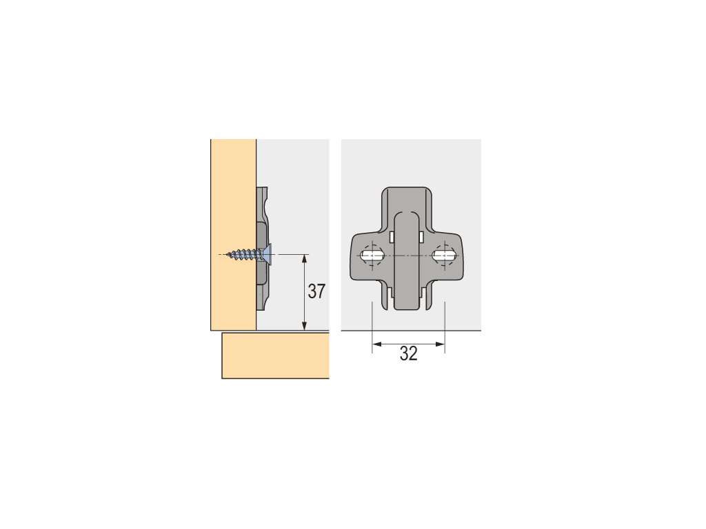 Montážna podložka pre Systém 8099 pre závesy Sensys a Intermat k naskrutkovaniu.Rozteč otvorov 32 mm. S oválnymi otvormi d=5,4 mm pre výškové nastavenie + - 3mm. Uchytenie skrutkami so zápustnou hlavou d=4,5 mm. Oceľ niklovaná.