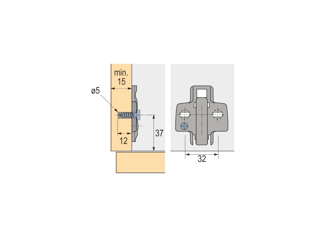 Montážna podložka pre závesy Sensys a Intermat Hettich Top s excentrickým nastavením výšky +-2mm. Hrúbka boku od 15mm. Rozteč otvorov 32 mm.