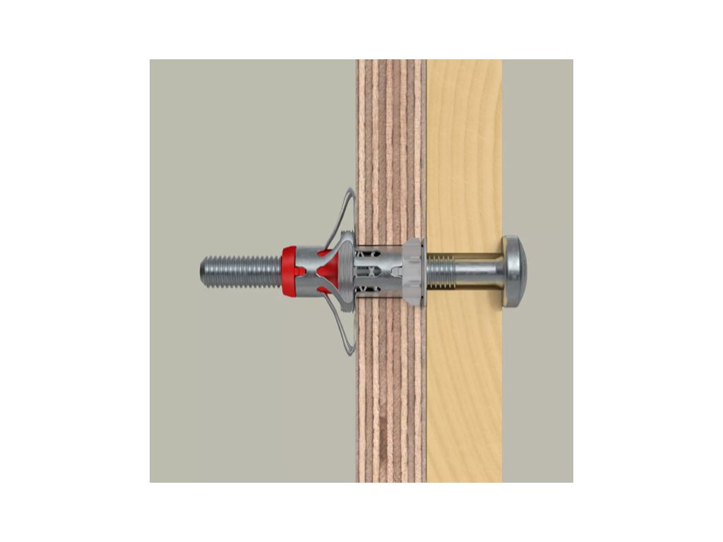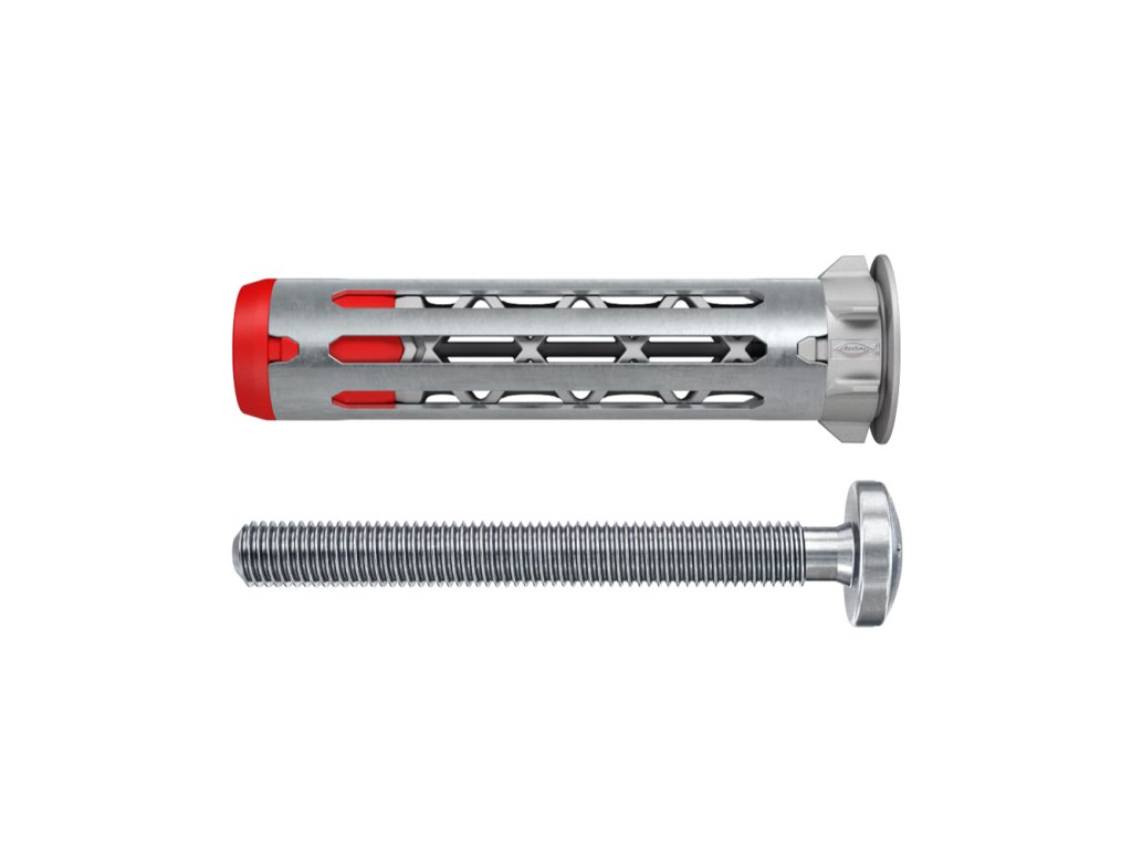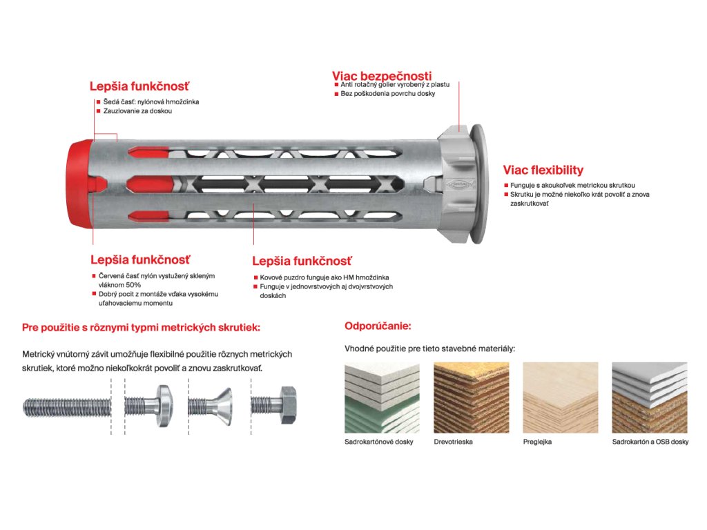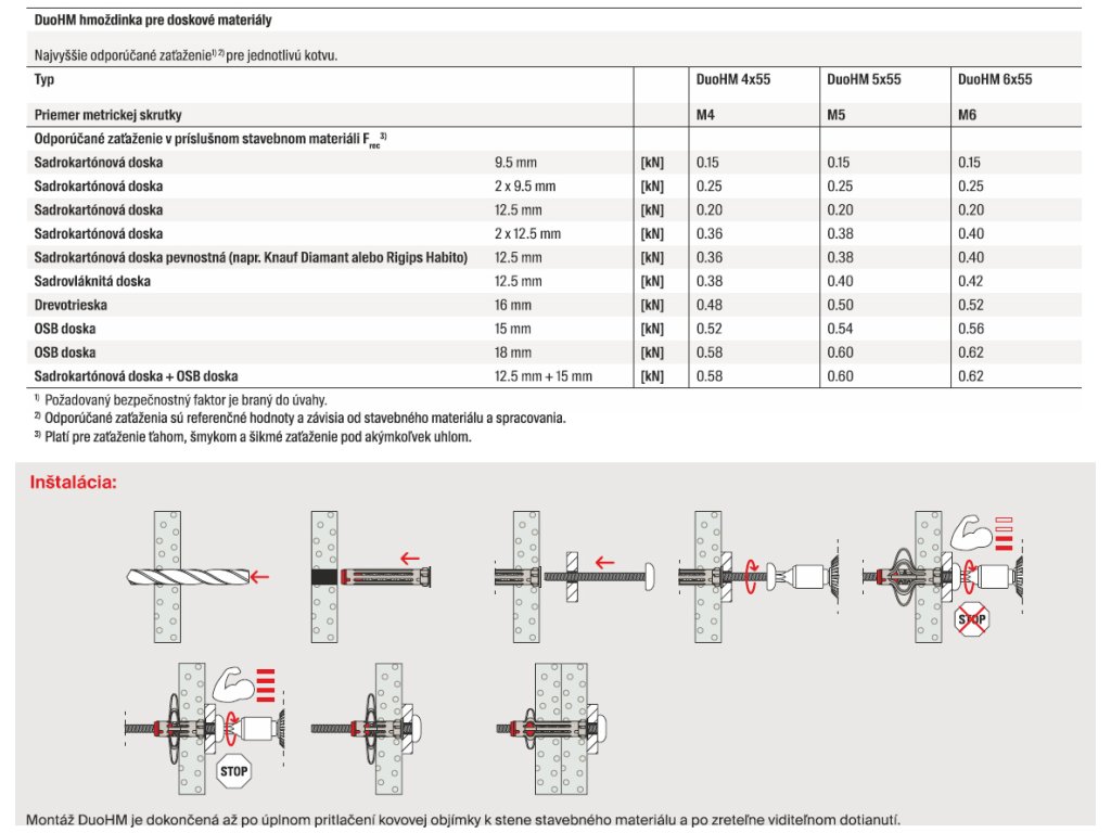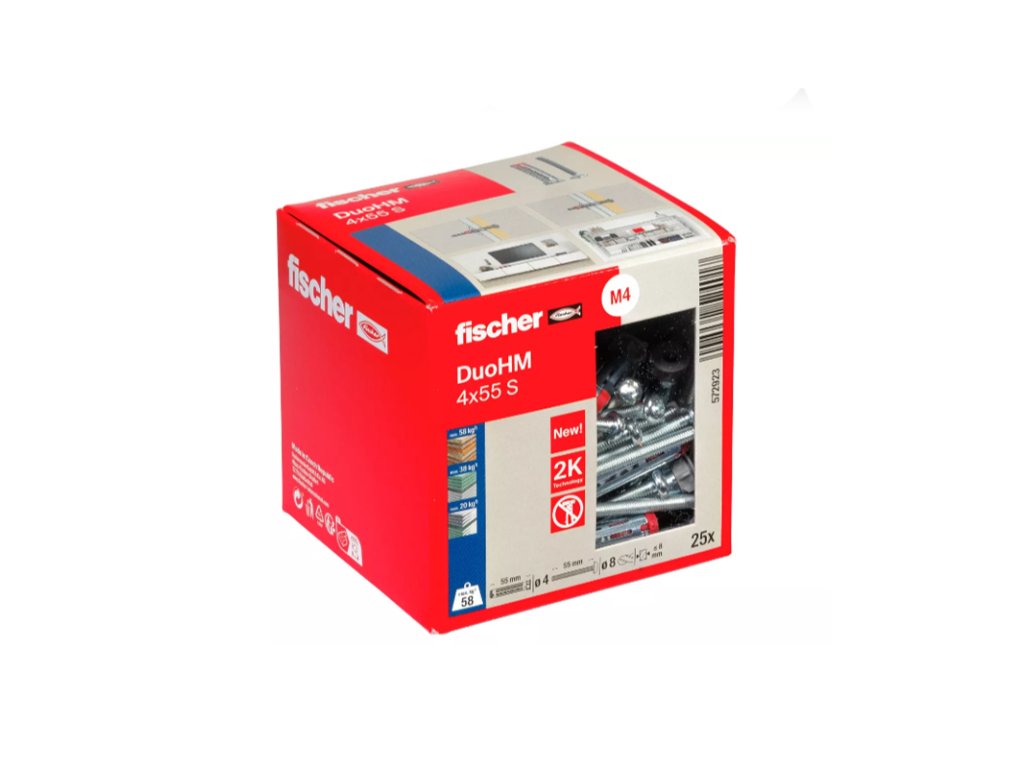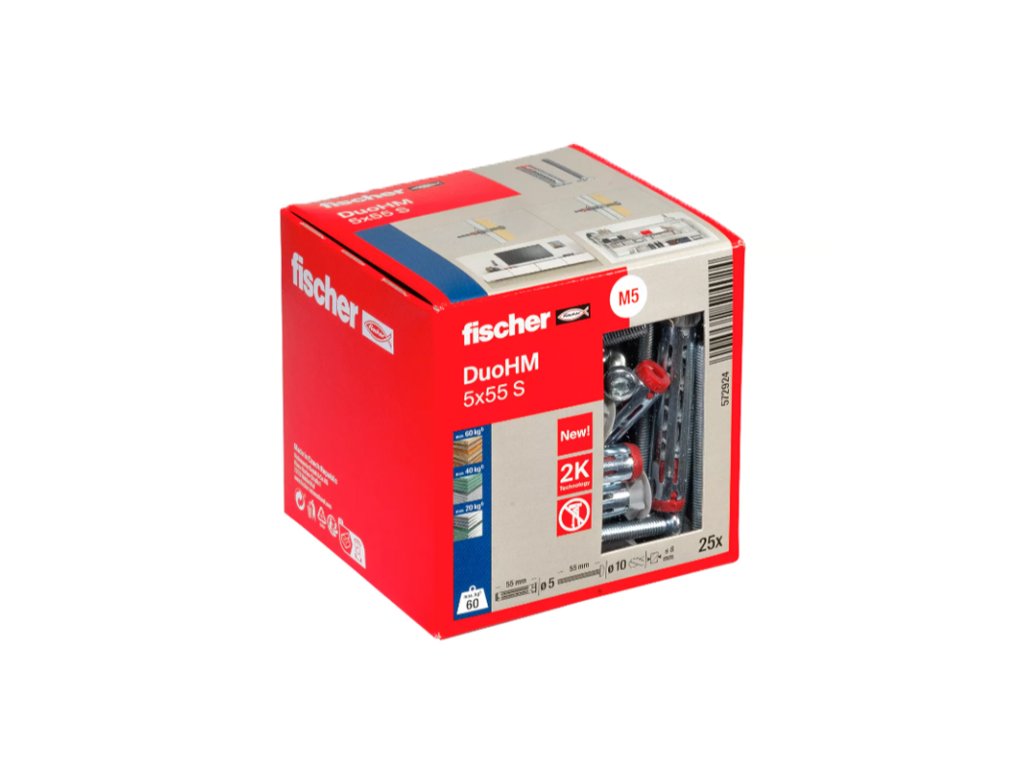 Hmoždinka DuoHM s jednou univerzálnou dĺžkou je vhodná pre všetky bežné hrúbky doskových materiálov od 9,5 do 30 mm. Vďaka novej a jedinečnej kombinácii nylonu a kovu umožňuje DuoHM vysoké zaťaženie a maximálnu flexibilitu v doskových materiáloch. Kovové puzdro sa sklopí za doskou a pritlačí sa k zadnej strane dosky, zatiaľ čo plastová hmoždinka sa za doskou zauzluje. DuoHM sa inštaluje rýchlo a jednoducho pomocou akumulátorového skrutkovača bez potreby použitia ďalších špeciálnych nástrojov. Čas montáže sa tak v porovnaní s bežnými sklopnými a preklopanými hmoždinkami skráti až o 50 %. Vďaka vnútornému metrickému závitu možno hmoždinku niekoľkokrát zaskrutkovať a vyskrutkovať. Okrem dodávanej skrutky je možné DuoHM používať aj s inými metrickými skrutkami. Nylonový golier odolný voči pretáčaniu chráni povrch stavebného materiálu pred poškodením. Vďaka malému priemeru goliera je hmoždinka za pripevňovaným predmetom neviditeľná.