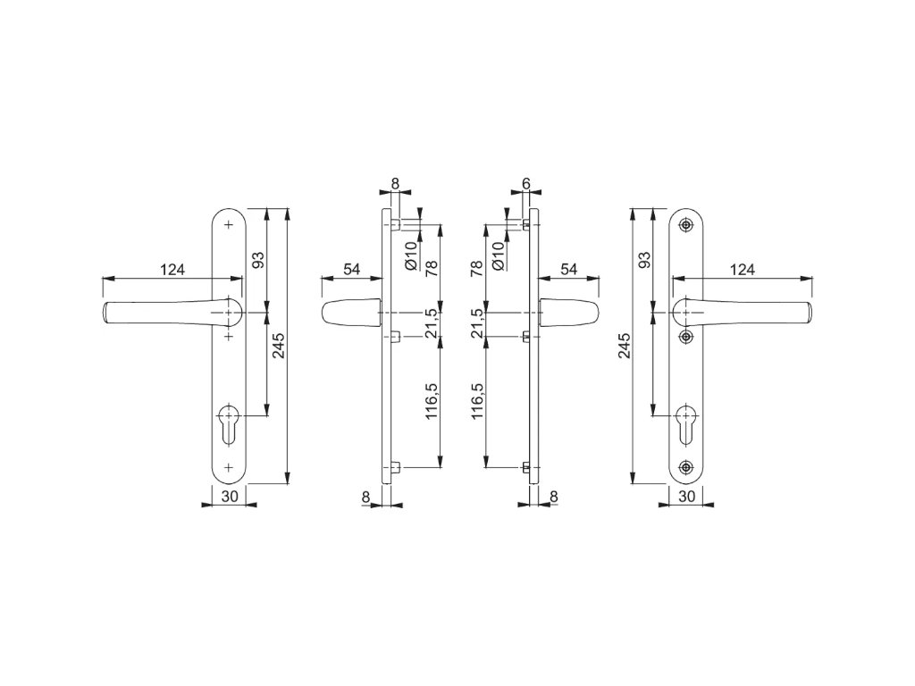 Vchodová kľučka pre profilové dvere s dlhým štítkom, rozteč 92 mm, šírka štítku 30 mm,