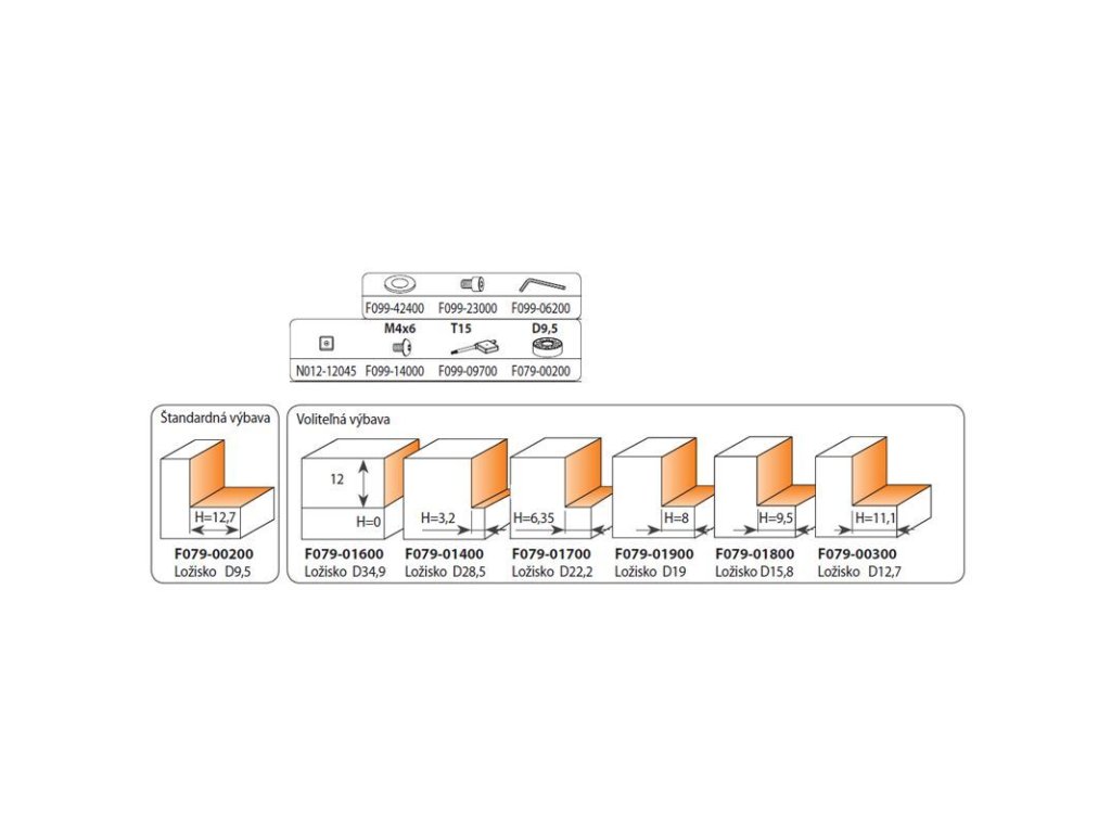 K tejto fréze je možné dokúpiť kopírovacie ložiská priemerov B = 9,5–12,7–19–22–28,5–34,9 mm, ktorými vyrobíte šírku falca H = 12,7–11,1–8–6,3–3,2–0 mm