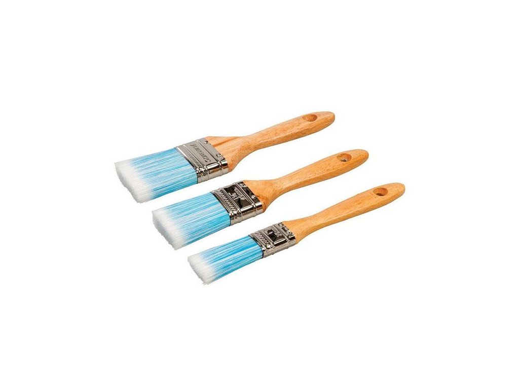 Sada lakovníckych plochých štetcov vhodných hlavne pre akrylátové (vodou riediteľné) farby. Drevené držadlo, štetiny zo syntetických vlákien. Veľkosti 25, 38 a 50 mm.