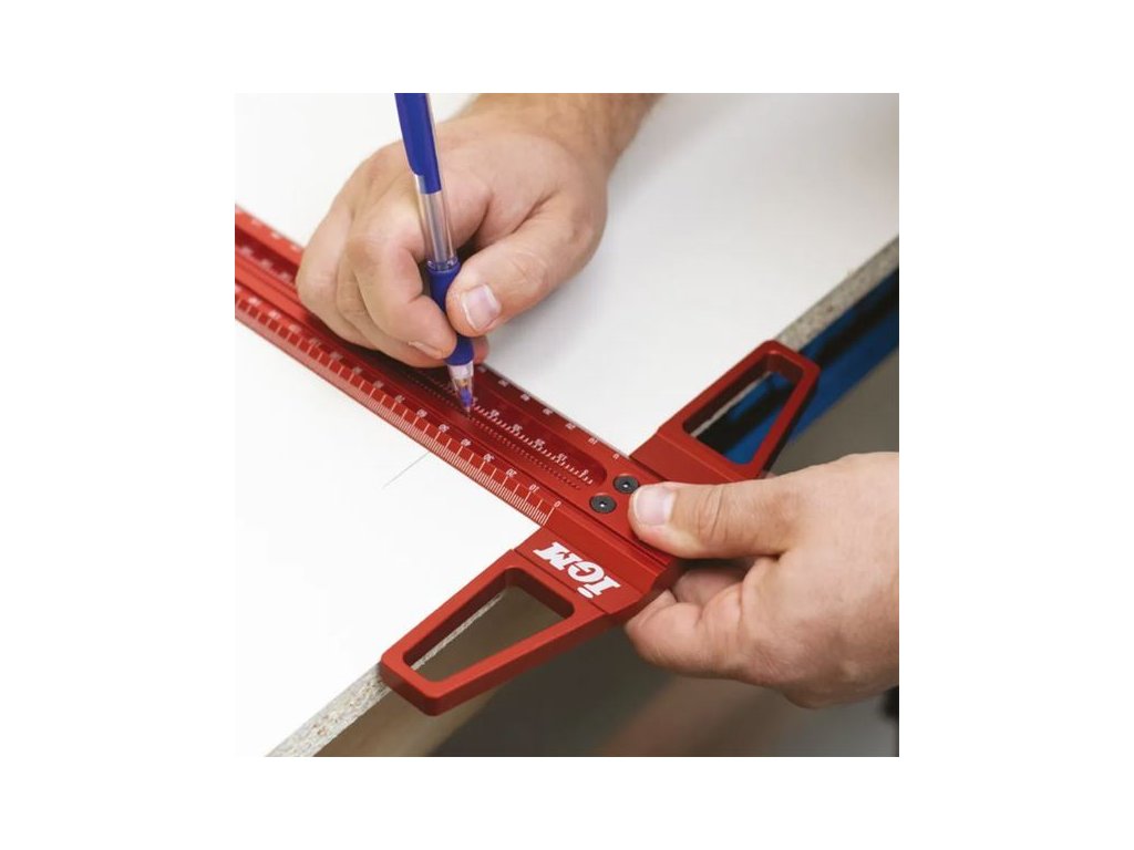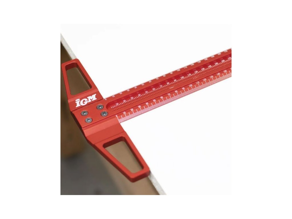 Presný značiaci a rozmerovací IGM 600mm príložník je vyrobený z eloxovaného duralu. Stupnica je vyznačená laserom po 1 mm. Okraje stupnice sú skosené smerom k pracovnej ploche pre presnejšie rysovanie. Príložník je vyrobený z dvoch dielov, a to základne a pravítka, ktoré do seba perfektne zapadajú vďaka CNC obrobeniu dosadacích plôch. Sú spojené 4 pevnými skrutkami. Príložník je tiež možné použiť ako pravítko, po odmontovaní základne. Uprostred pravítka sú v dvoch radoch značiace otvory pre rovnobežné značenie po 1 mm. Stačí vložiť hrot ceruzky do otvoru a nakresliť dokonale rovnú čiaru pozdĺž dosky.