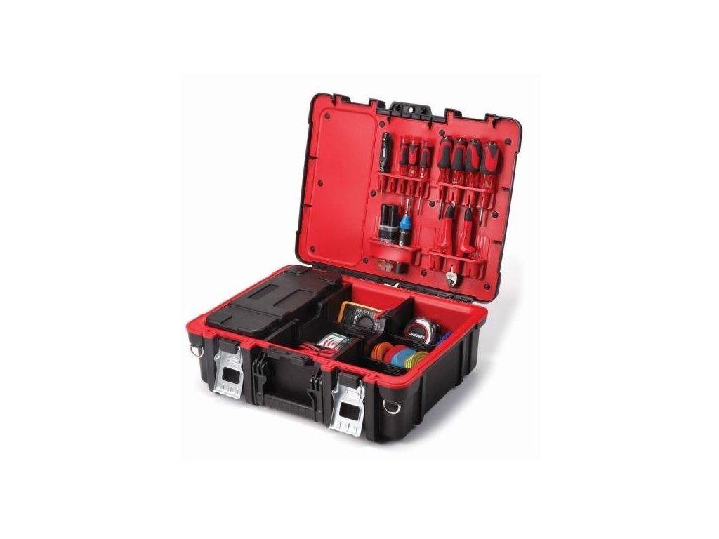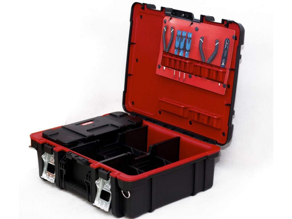 Praktická skrinka s veľkým objemom. Jej vnútro uľahčuje skladovanie náradia rôznych veľkostí, organizér v skrinke umožňuje ľahší prístup k najčastejšie používanému náradia. Výrobok bol navyše vybavený vyberateľným organizérom s prepážkami. Vďaka pohodlnému držadlu možno skrinku bez problému prenášať. Produkt bol vyrobený z vysoko kvalitných materiálov, čo zaisťuje jeho stálosť a odolnosť.