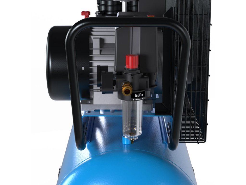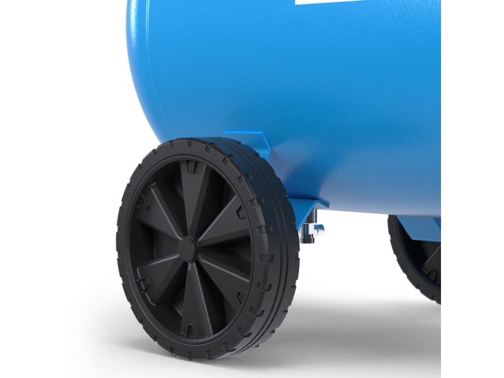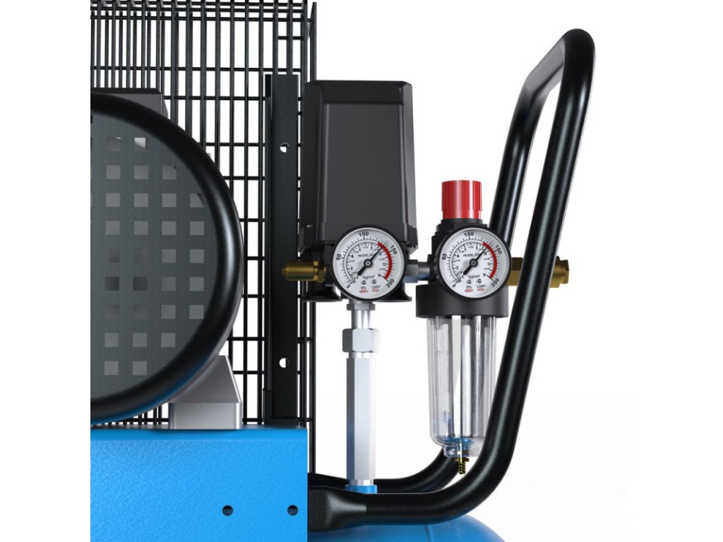Výkonný dvojvalcový agregát s olejovým mazaním a remeňovým pohonom so sacím výkonom 650 litrov za minútu zabezpečuje dostatok vzduchu pri požadovanom pracovnom tlaku. Tlakový spínač spoľahlivo a automaticky reguluje rozsah tlaku 8 – 10 bar. Pomocou redukčného ventila zabezpečuje jednoduché nastavenie pracovného tlaku. Vďaka manometru na meranie tlaku v nádobe a manometru na meranie pracovného tlaku budete mať vždy dokonalý prehľad. Dve spojky na stlačený vzduch zabezpečujú flexibilné pripojenie. Bezpečnostný ventil, spätný ventil a skrutka na vypúšťanie kondenzátu zaisťujú bezpečnosť a čistotu. Transportná rukoväť uľahčuje prepravu. Integrovaný vzduchový filter, ako aj odlučovač vody s filtrom zabezpečujú čistý a suchý vzduch. Ochrana proti preťaženiu a chladič plniaceho vzduchu zaručujú dlhodobú prevádzku. Zariadenie sa ľahko premiestňuje na stabilných plastových kolesách a dvoch otočných kolieskach.