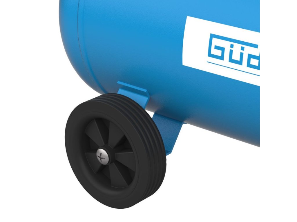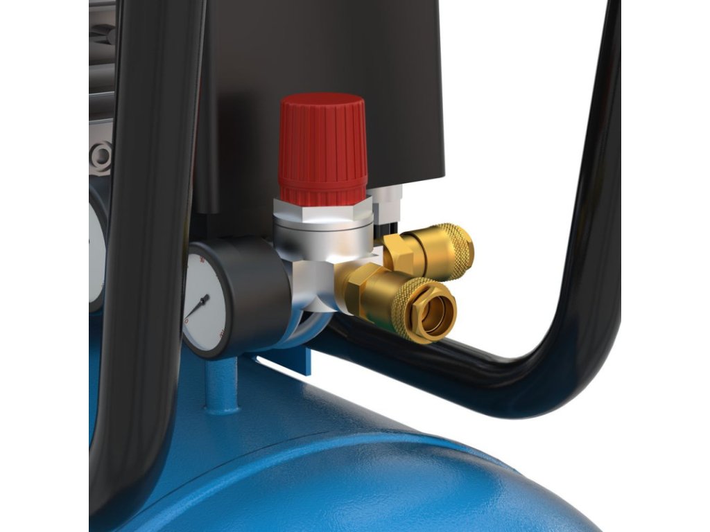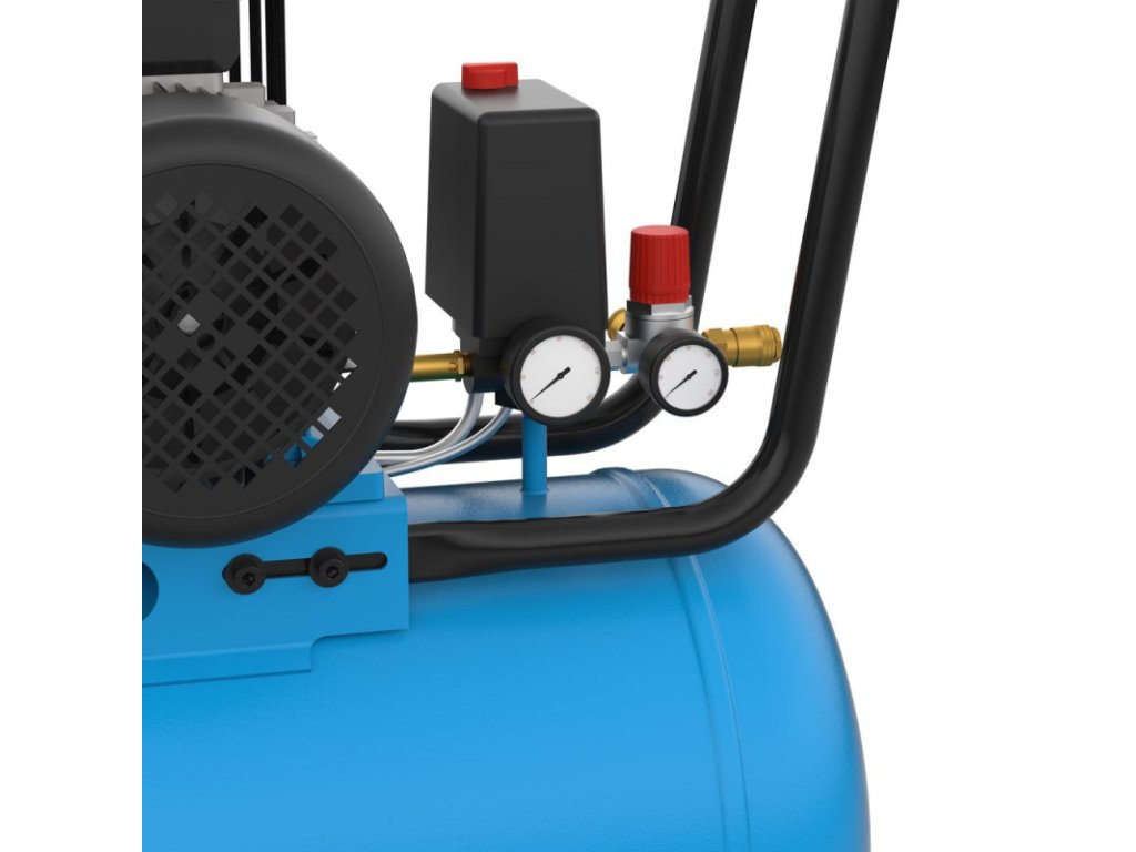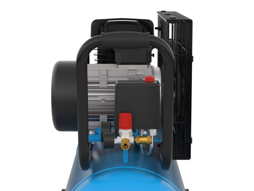 Dvojvalcový kompresor s olejovým mazaním, remeňovým pohonom, rukoväťou na prenášanie, tlakovým spínačom, dvomi manometrami (manometer na meranie tlaku v nádobe a pracovného tlaku), dvoma pneumatickými spojkami, chladičom plniaceho vzduchu. Bezpečnostný ventil, spätný ventil, vypúšťacia skrutka na kondenzát, plastové kolieska a vzduchový filter.