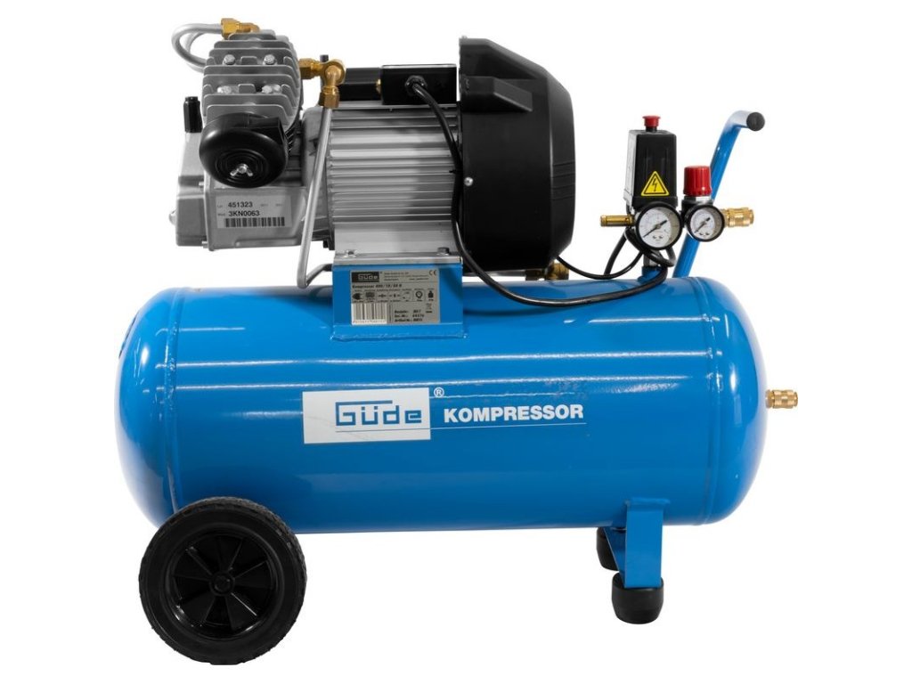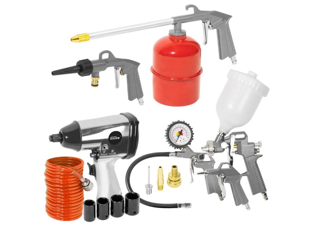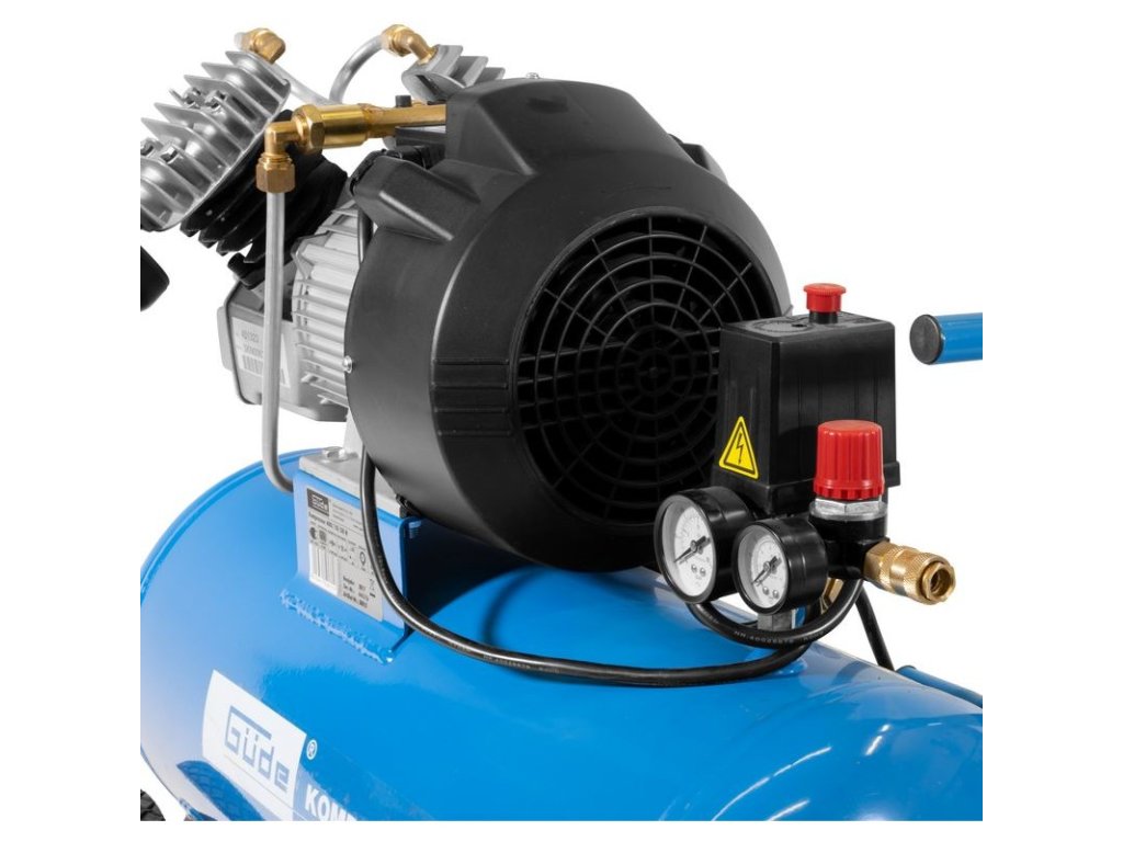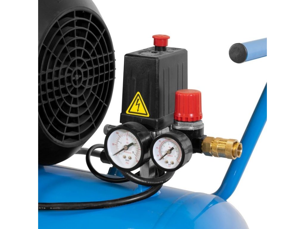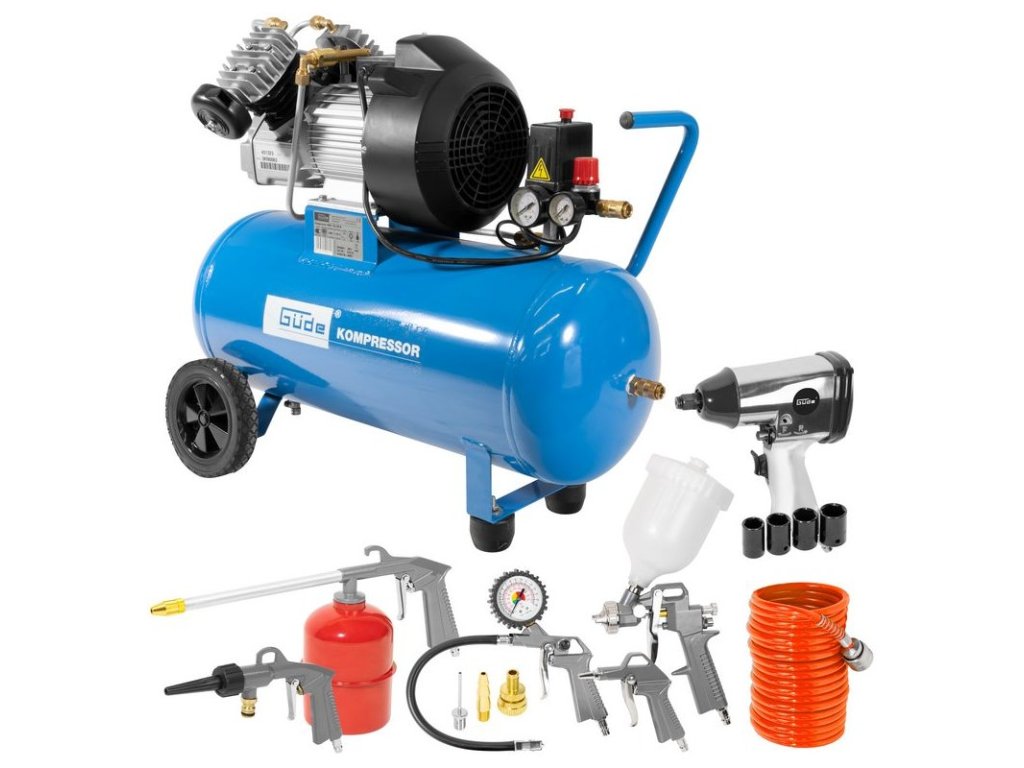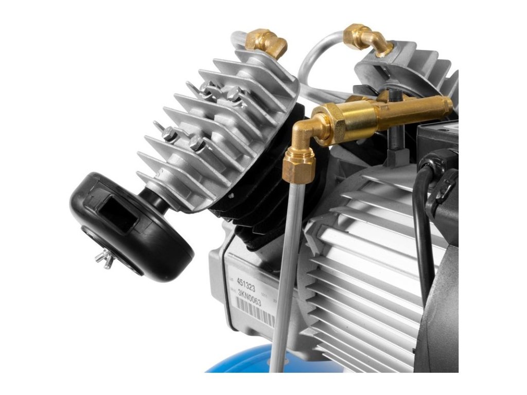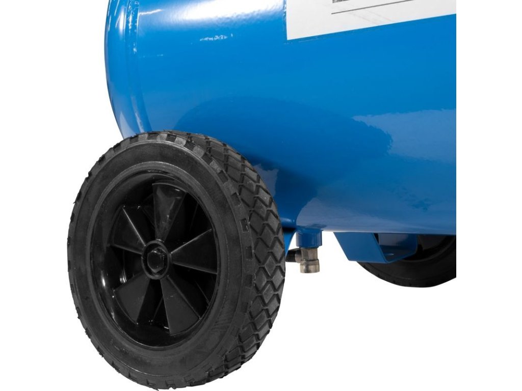 Dvojvalcový V-agregát s olejovým mazaním, s priamym pohonom. Tlakový spínač, manometer tlaku v nádobe a manometer pracovného tlaku, 2 spojky na stlačený vzduch, redukčný ventil pracovného tlaku, poistný ventil, vypúšťací ventil na kondenzát. Dvojitá noha s gumovým nárazníkom, plastové kolesá, prepravná rukoväť. Sada náradia na stlačený vzduch obsahuje 5 m PU hadicu špirálovú so spojkou, vyfukovaciu pištoľ, pištoľ na nanášanie farby, pištoľ na vodu, pištoľ na olej, hustilku pneumatík, 3 ks mosadzných adaptérov, rázový uťahovák 1/2" s nadstavcami (15, 17, 19, 21 mm).