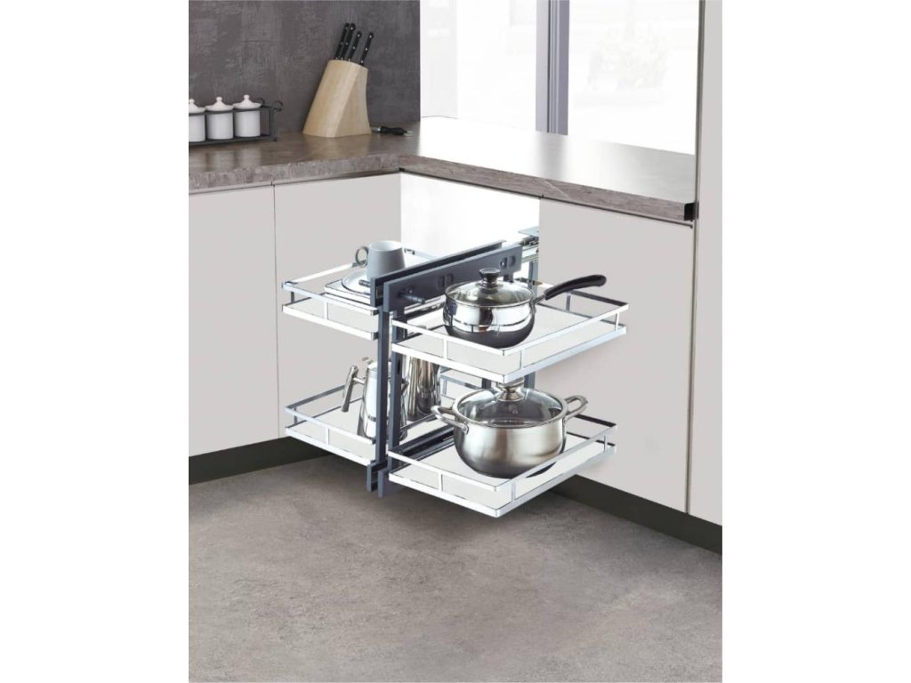 Hladké posuvné koľajničky zaisťujú, že sa organizér rohovej skrinky vysunie úplne mimo skrinky, aby sa uľahčil prístup k ťažko dostupným predmetom. Stačí jednoducho vytiahnuť prvý pár políc a v najvzdialenejšom rohu sa automaticky presunú a dajú sa vysunúť hneď za prvú súpravu. Pokročilá technológia tichého tlmenia umožňuje rovnomernú rýchlosť vyťahovania, pracuje stabilne a ticho.