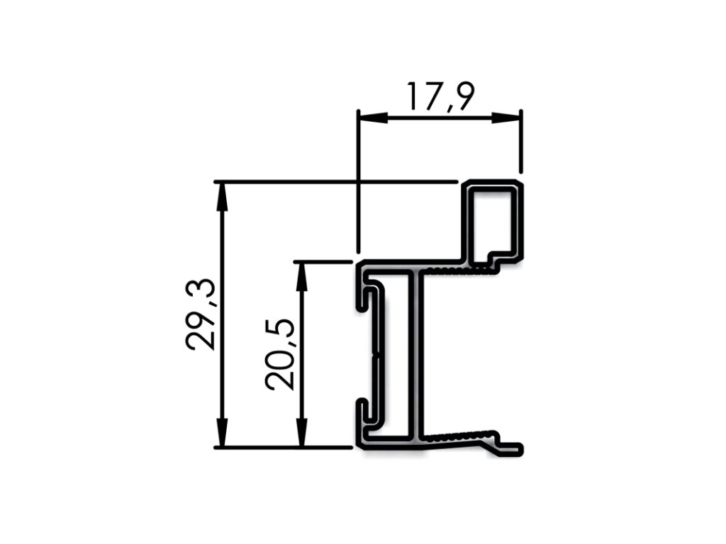 Vertikálny profil vyrobený z hliníka. Navrhnuté pre 16 mm alebo 18 mm hrubé dosky a 4 mm hrubé sklo.