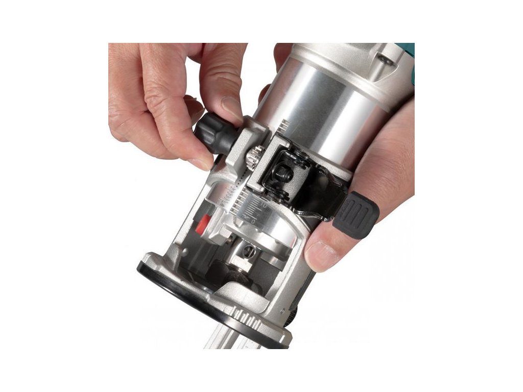 - Presne nastaviteľné a uzamykateľné jemné nastavenie hĺbky frézovania.