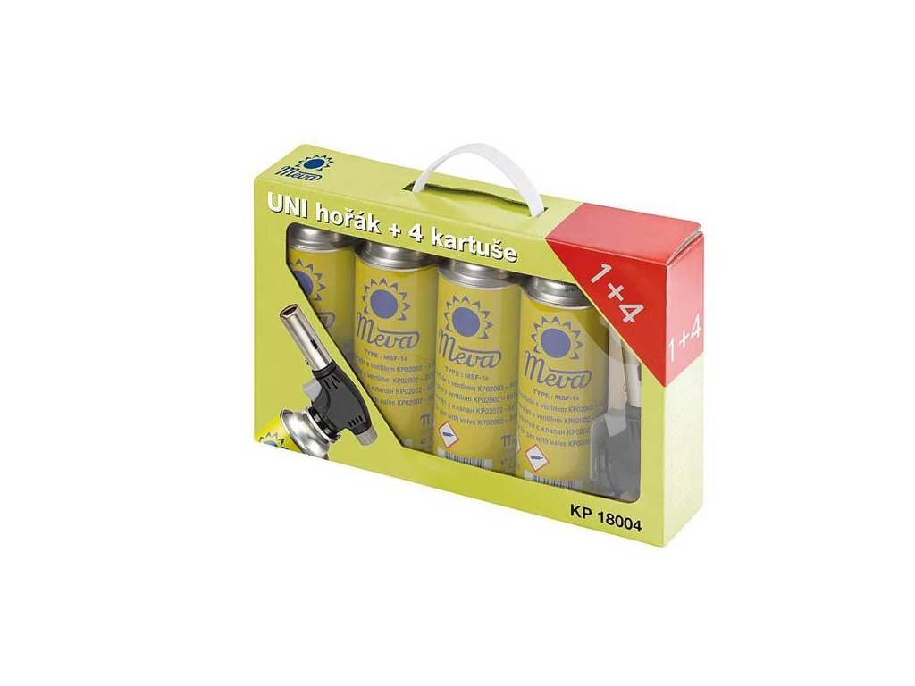 Univerzálny horák s piezoelektrickým zapaľovaním v praktickom sete so 4 kartušami.