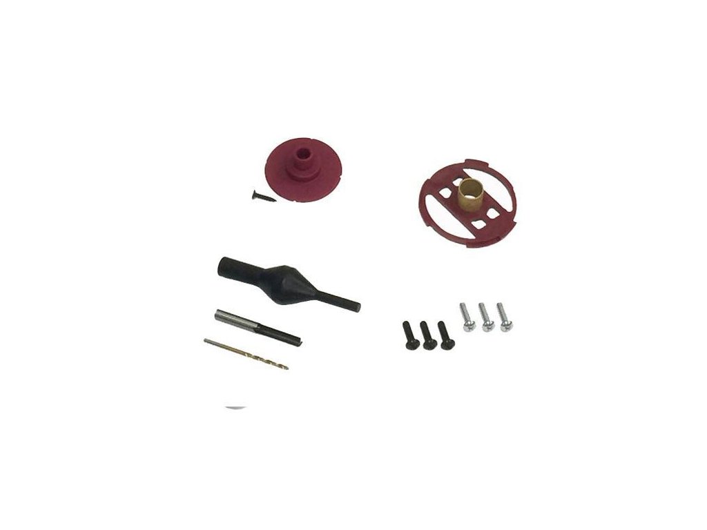 Malý kruhový prípravok, veľký kruhový prípravok, odsadená základňa, základná doska TurnLock™, 1/4" rovná fréza, vrták, centrovací kolík, puzdro a montážny hardvér.