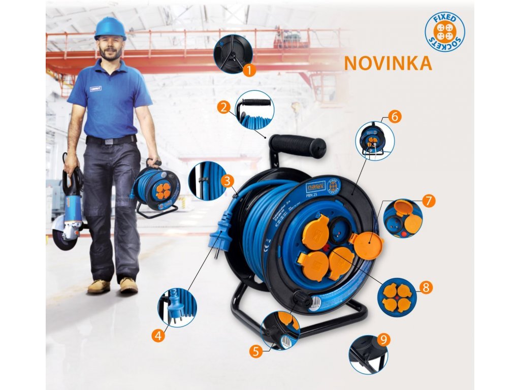 - 5 - Cievka bubna z vysoko kvalitného polypropylénu (PP). Pohodlné navíjanie kábla po celej dĺžke vďaka otočnej ergonomickej bočnej rukoväti.