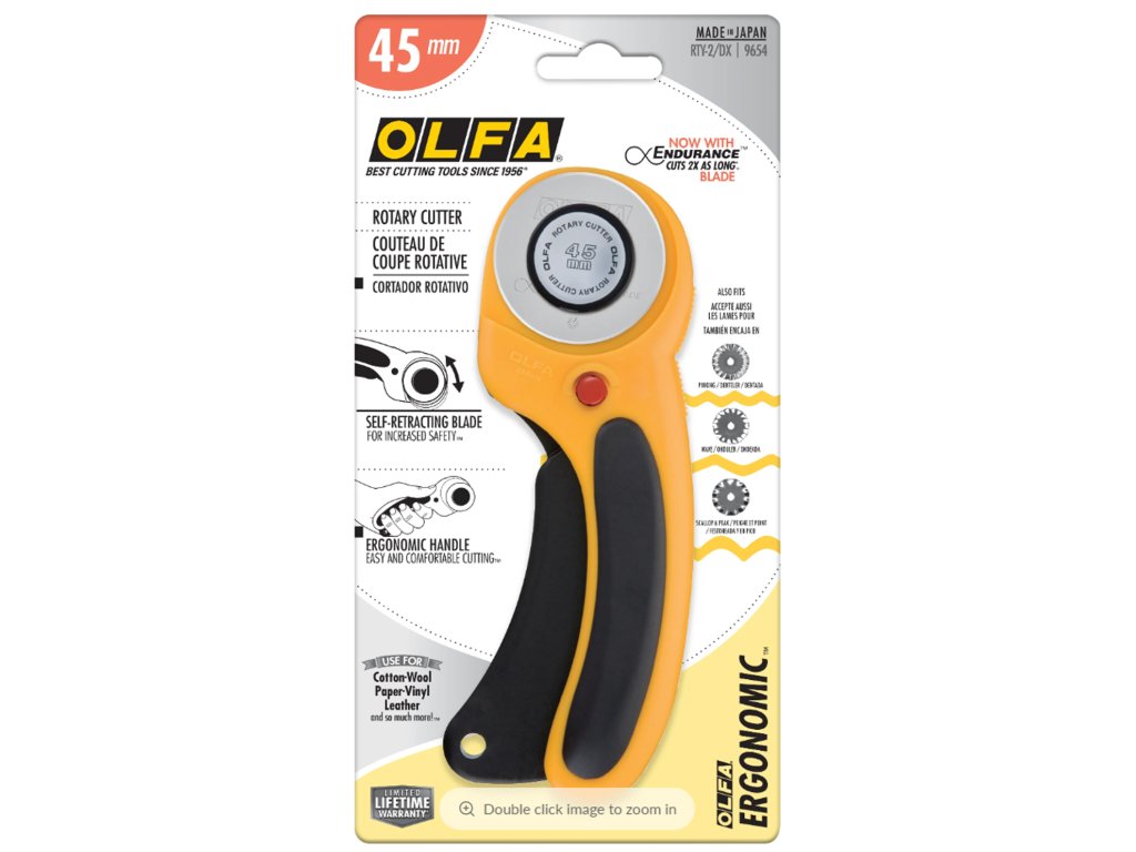 Tento žiletkový nôž Olfa s kruhovým kotúčom je perfektný pre všetky vaše potreby pri šití a prešívaní v krajčírskej dielni. Je dostatočne ostrý na to, aby prerezal viac ako 6 vrstiev látky, čím vám umožní rýchlo vystrihovať pásy, bloky a vzory. Táto rotačná rezačka OLFA® je kombináciou pohodlia, praktickosti, pevnosti a bezpečnosti. Jeho ergonomická rukoväť s protišmykovou gumovou rukoväťou eliminuje únavu a stres rúk, zatiaľ čo spúšť umožňuje, aby sa čepeľ sama zasunula pre bezpečnosť alebo sa zaistila v otvorenej polohe pre pohodlie. Funkcia rýchlej výmeny čepele nespomalí váš projekt. Čepeľ je vyrobená z vysoko kvalitnej nástrojovej ocele z karbidu volfrámu pre bezkonkurenčnú ostrosť a vynikajúcu fixáciu ostria. Pre pravákov aj ľavákov.