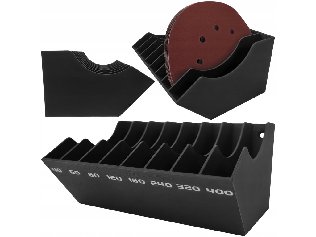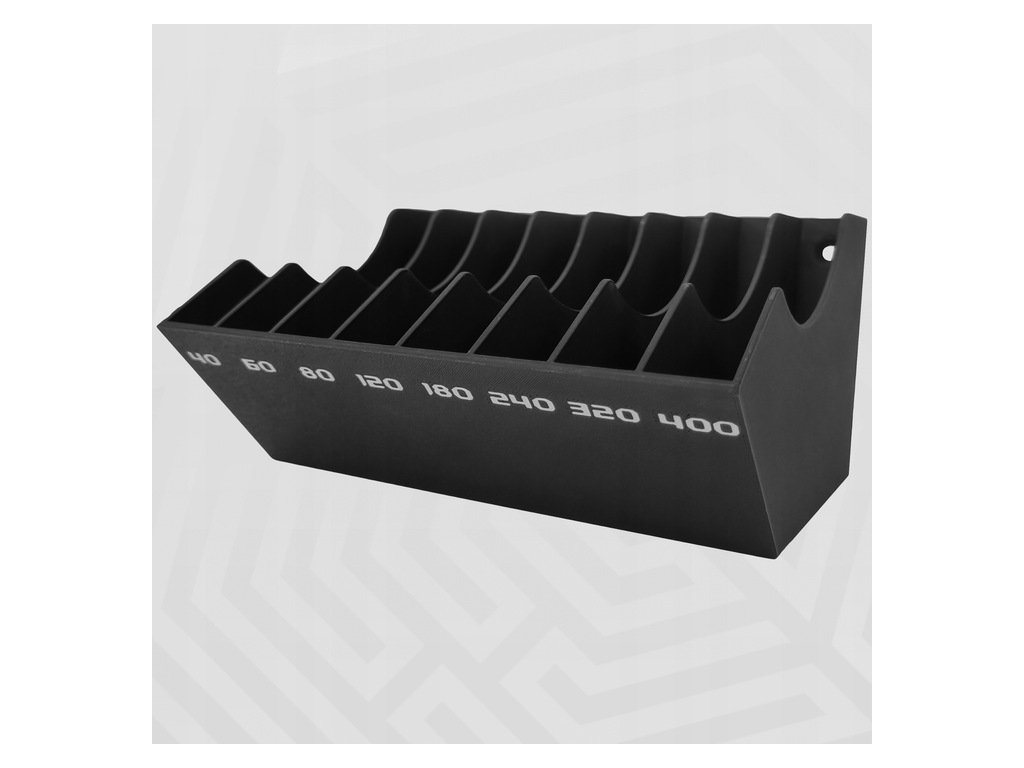 Praktický držiak na uloženie brúsnych papierov. Vďaka rozdeleniu na priehradky môžete roztriediť papiere podľa zrnitosti a mať vždy rýchly prístup k vhodnému typu.