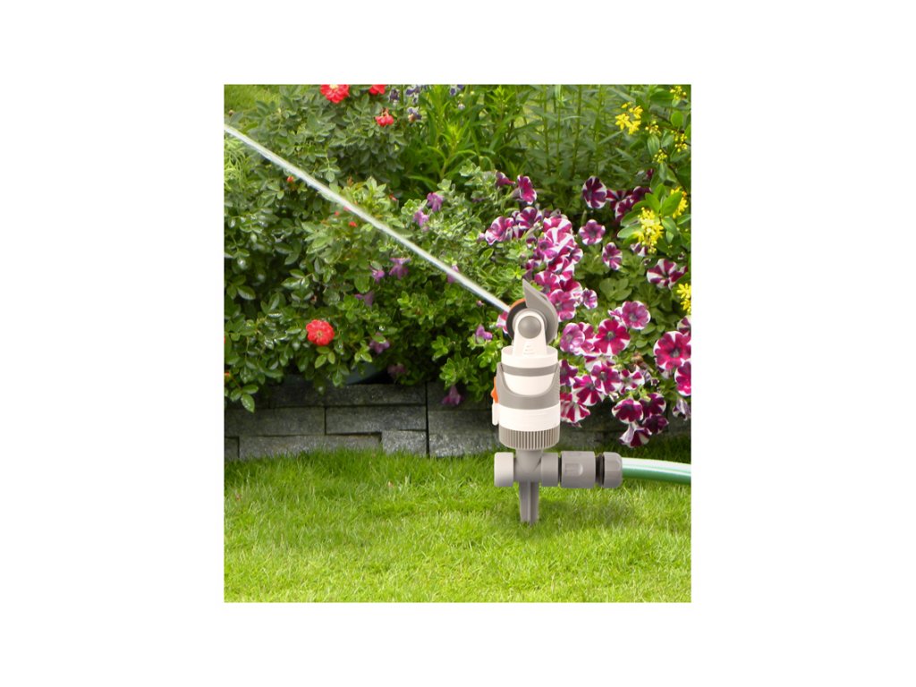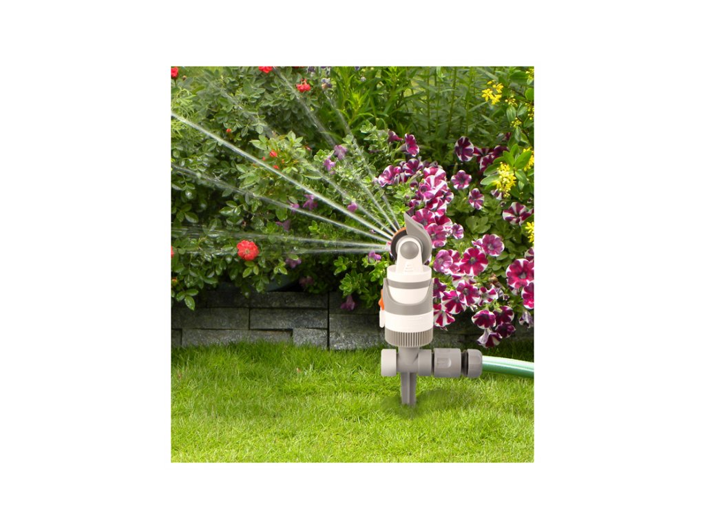 Nastaviteľný 4-funkčný pulzný zavlažovač s prípojkou vody na rýchlospojku. Otočná hlava na reguláciu rozstreku, regulovaný rozsah závlahy pre čiastočný kruh alebo 360°. Tichý chod. Plastový bodec s možnosťou zapojenia do série.