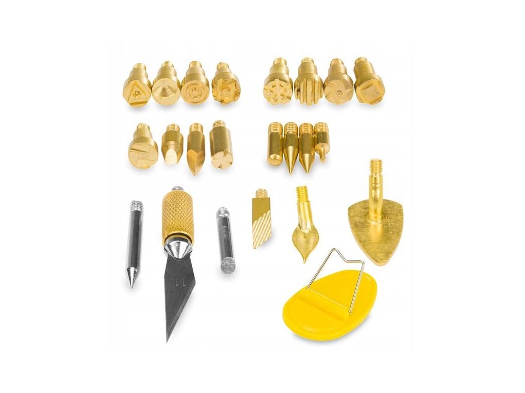 Sada obsahuje 22 hrotov, vďaka ktorým môžete vypaľovať rôzne druhy vzorov na drevo, korok alebo kožu. Pripojený nôž po zahriatí uľahčí rezanie rôznych materiálov. Mosadz z ktorej sú hroty vyrobené sa veľmi rýchlo zahreje na prevádzkovú teplotu. Sada obsahuje stojan na ktorý môžete zariadenie bez obáv odložiť. Sada obsahuje 22 rôznych hrotov.