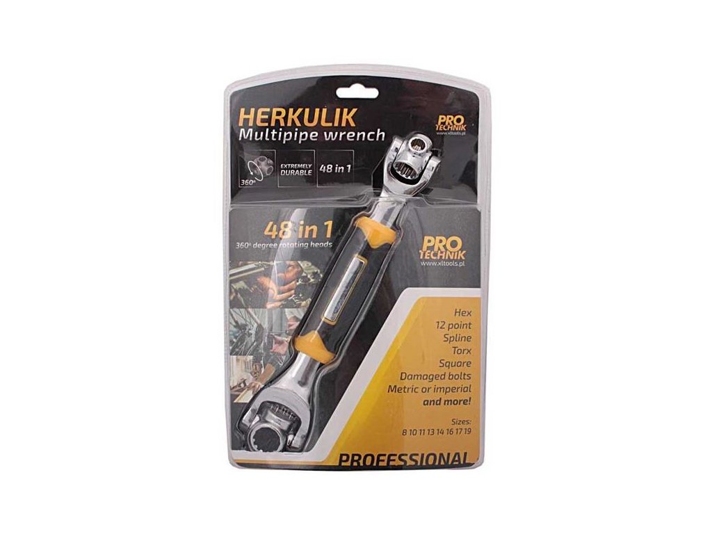 Univerzálny kľúč HERKULIK je praktická pomôcka, ktorú možno použiť v aute, na pozemku aj pri výletoch na bicykli. Vďaka otočným hlavám s račňami a pogumovanej rukoväti je práca s týmto náradím pohodlná a jednoduchá. Kľúč môže nahradiť až 48 rôznych kľúčov rôznych veľkostí, čo ušetrí miesto a zdvíhanie ťažkého náradia. Možno použiť pre skrutky s priemerom 8 mm až 19 mm.