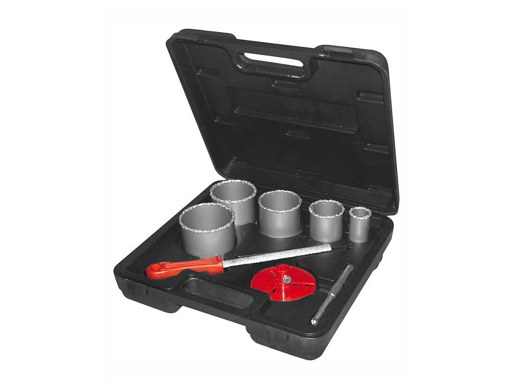 8 dielna sada vykružovacích diamantových koruniek v kufri. Sada je určená na vŕtanie do extrémne tvrdých materiálov ako sú keramické obklady a dlažba. Súčasťou sady je aj unášač vykružovacích koruniek a strediaci vrták so šesťhrannou stopkou a pilník.