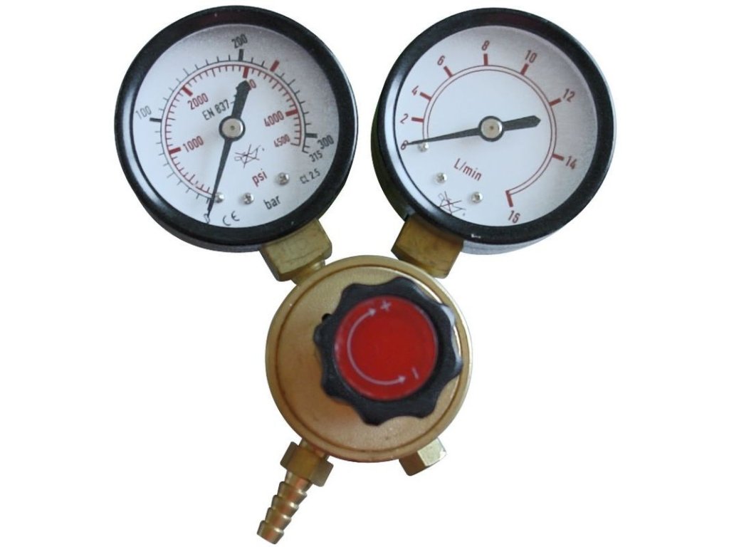 Regulátor tlaku jednostupňový podľa DIN E 585, tryska na výstupe, vysoká presnosť regulácie.