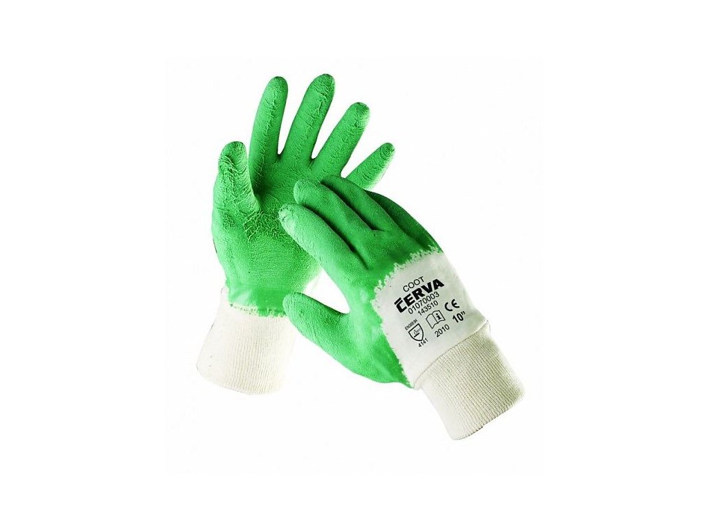 Zelené rukavice šité z bavlneného úpletu, s protišmykovým povrchom, pružným nápletom na zápästí a máčanými dlaňami a prstami v kaučuku.
