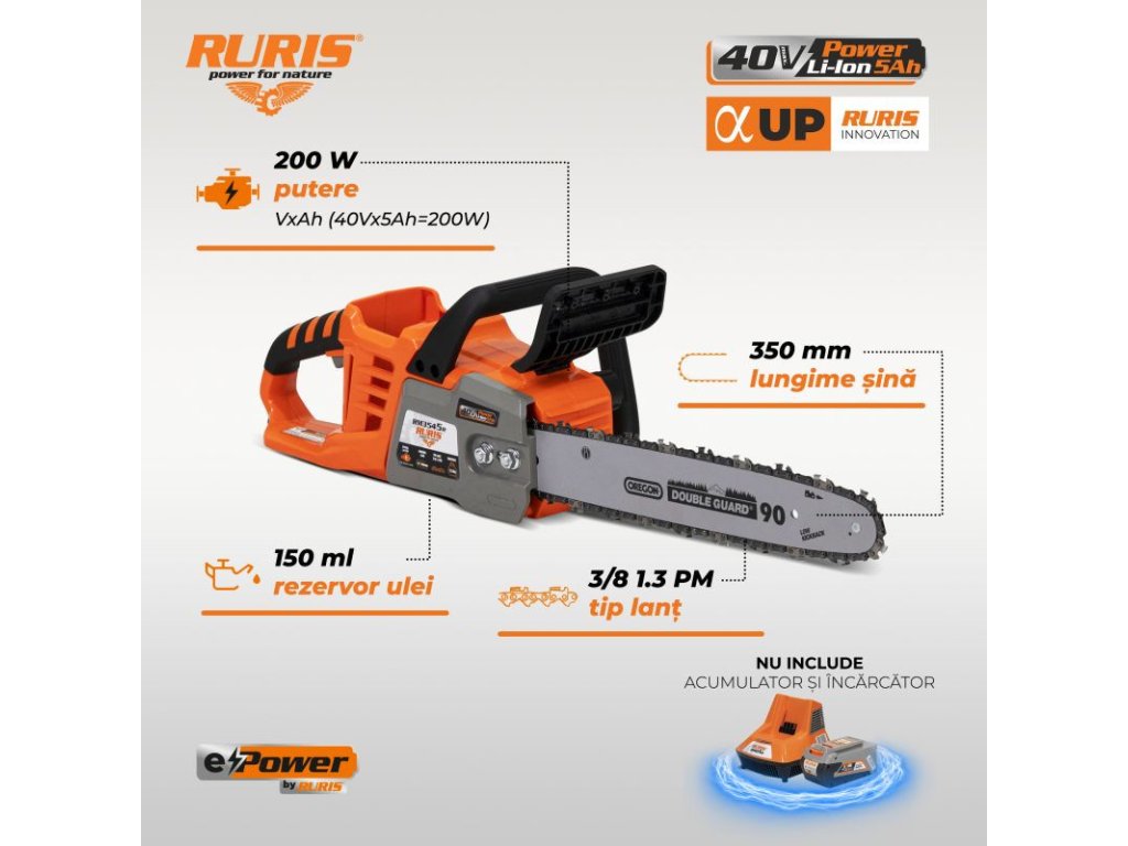 Ďalšou dôležitou výhodou akumulátorovej reťazovej píly RURIS RM3545e je, že nevypúšťa výfukové plyny, vďaka čomu je ekologickejšia a šetrnejšia k životnému prostrediu ako modely s benzínovým motorom. Elektromotor je tiež jednoduchší a lacnejší na údržbu ako benzínový motor, pretože nevyžaduje výmenu oleja a inú súvisiacu údržbu.