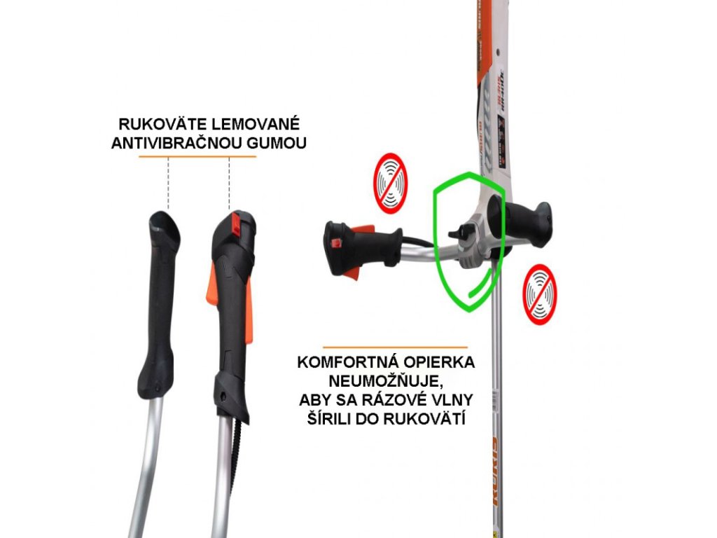 ▪ Krovinorez RURIS ťaží z rýchlonastaviteľnej konzoly nastavenia rukoväte RURIS PlusConfort, ktorá znižuje námahu pri pohybe zľava doprava počas kosavnia o viac ako 50 % v porovnaní s klasickým krovinorezom.