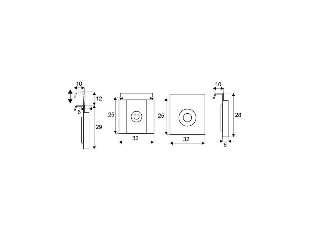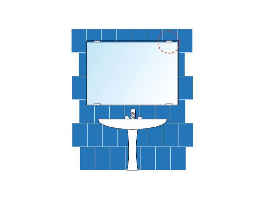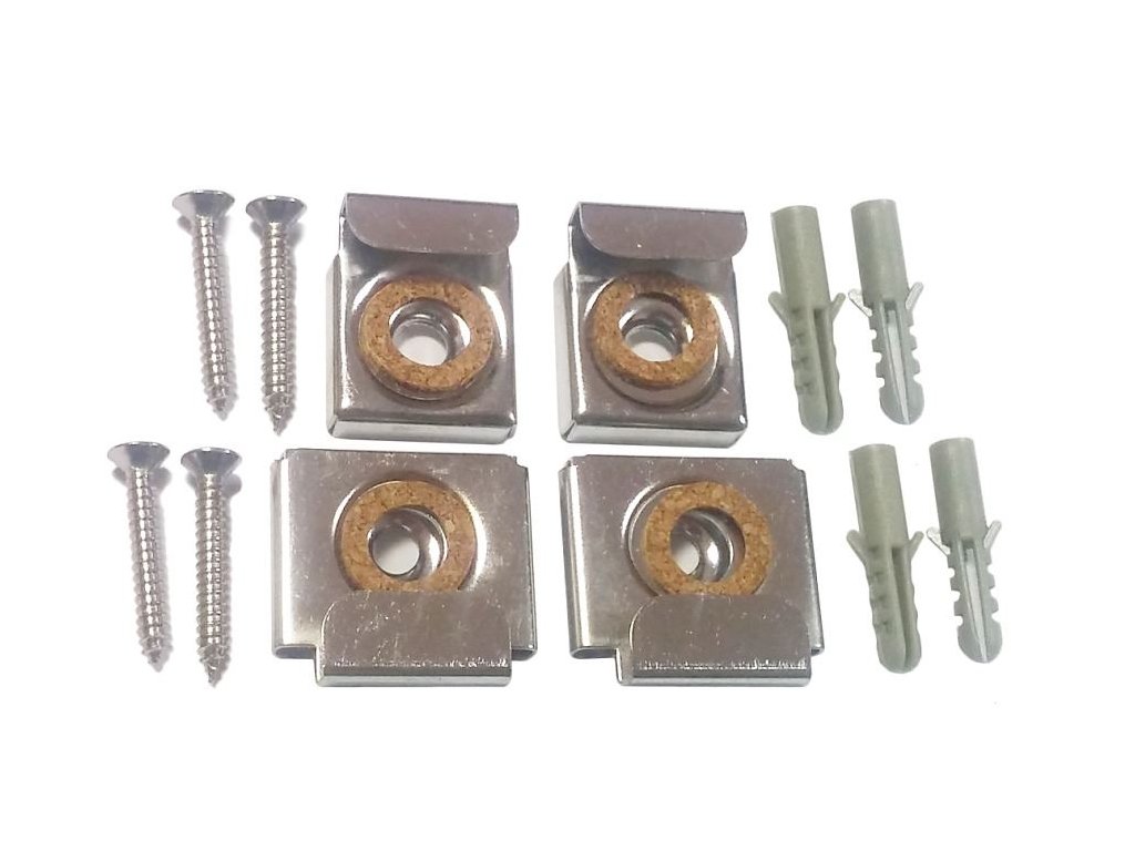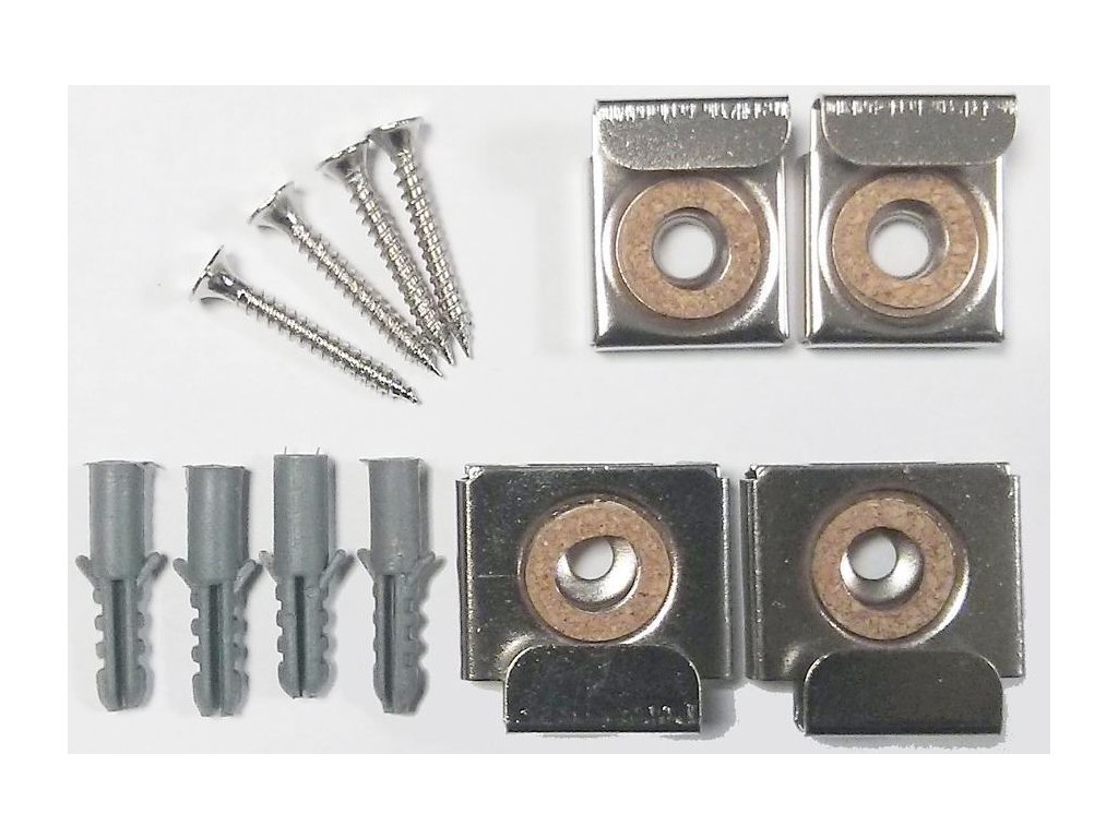 Sada na uchytenie zrkadla na stenu. Obsahuje: 2 vrchné a 2 spodné držiaky, 4 x hmoždinka, 4 x skrutka na uchytenie.