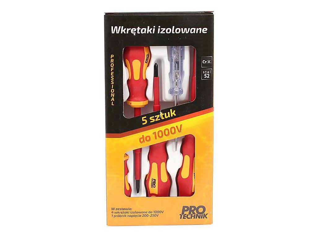 Profesionálne elektrikárske skrutkovače VDE 1000V 5 ks. Ergonomická dvojzložková rukoväť potiahnutá gumou poskytuje pevné uchopenie a poskytuje pohodlie pri práci. Hrot vyrobený z vysoko kvalitnej ocele S2 a Cr.V. Skrutkovače sú zabalené v škatuli. Skrutkovače sú schválené VDE. Každá sada bola testovaná pod vysokým napätím pred zabalením do obalu.
