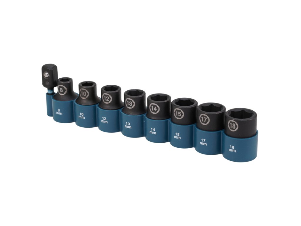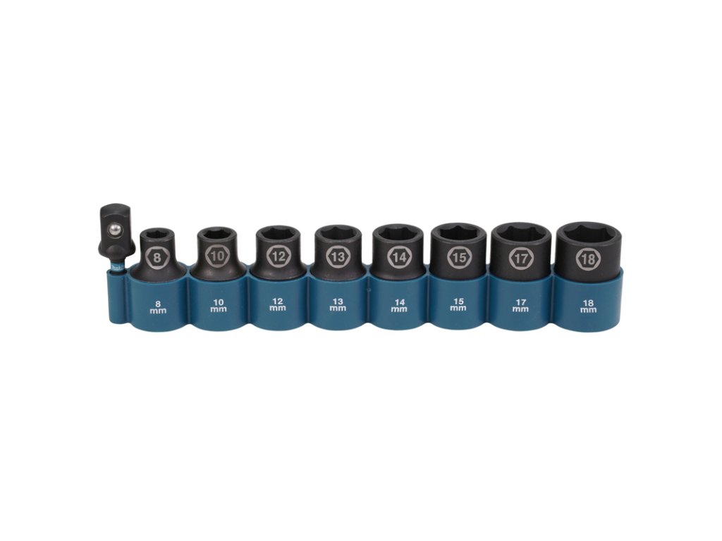 Osem nástrčných kľúčov so štvorcovou násadou 1/2" vo veľkostiach 8, 10, 12, 13, 14, 15, 17, 18 mm.