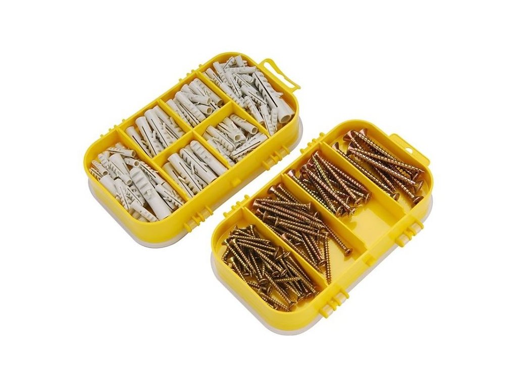 - hmoždinky 85 ks: 40 ks - 5 x 25 mm, 25 ks- 6 x 30 mm, 12 ks- 8 x 40 mm, 8 ks-10 x 50 mm.