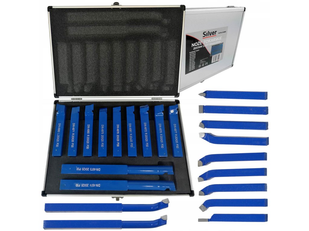 Sada sústružníckych nožov 20x20 mm z vysoko kvalitnej ocele. Ostria nožov zo spekaného karbidu umožňujú presné spracovanie kovov.
