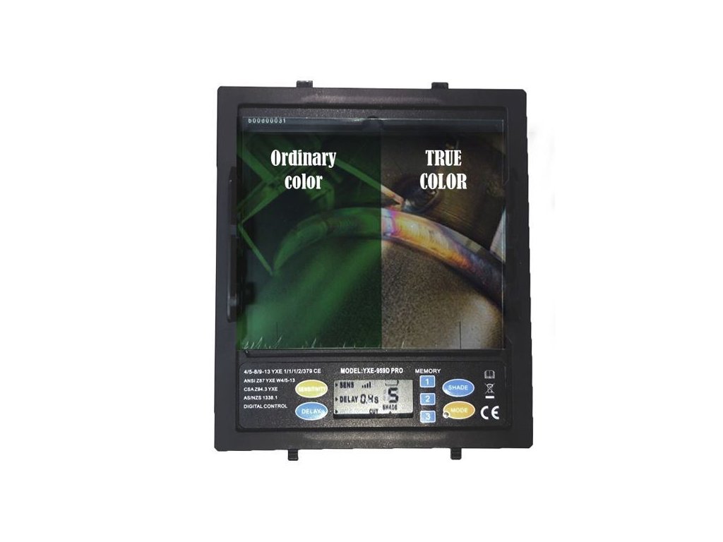 - samozatemňovacia kazeta je vyrobená s použitím technológie TRUE COLOUR (skutočné farby). Toto uľahčuje lepšie rozlíšenie farieb a tým rozlíšenie farieb žeravého kúpela zvaru a určenie jeho teploty. Zároveň ľahšie čítanie na LED displeji kukly. Toto zlepšuje lepšiu viditeľnosť zváracej zóny a zmiernenie namáhania očí a zvýšenie produktivity práce.