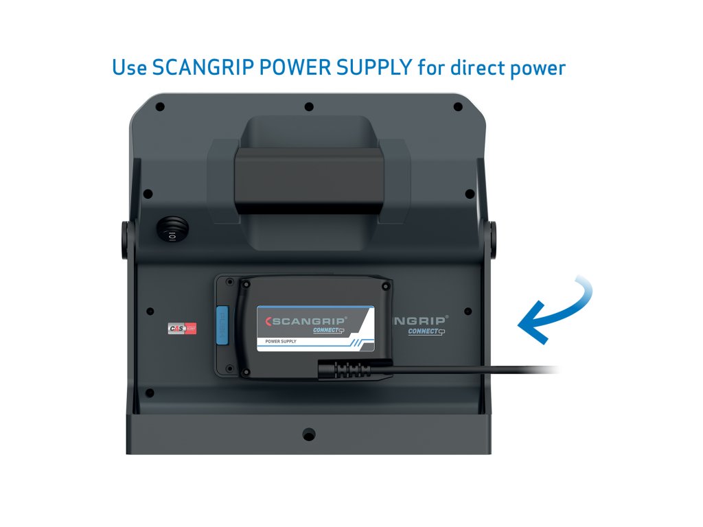 VEGA 4 CONNECT je kompatibilná s akumulátorovým systémom METABO/CAS 18 V a všetkými ostatnými akumulátorovými blokmi 18 V/20 V od popredných značiek elektrického náradia pomocou konektora SCANGRIP. Okrem toho je možné napájací zdroj SCANGRIP použiť na priame napájanie, ktoré poskytuje neobmedzenú dostupnosť svetla.