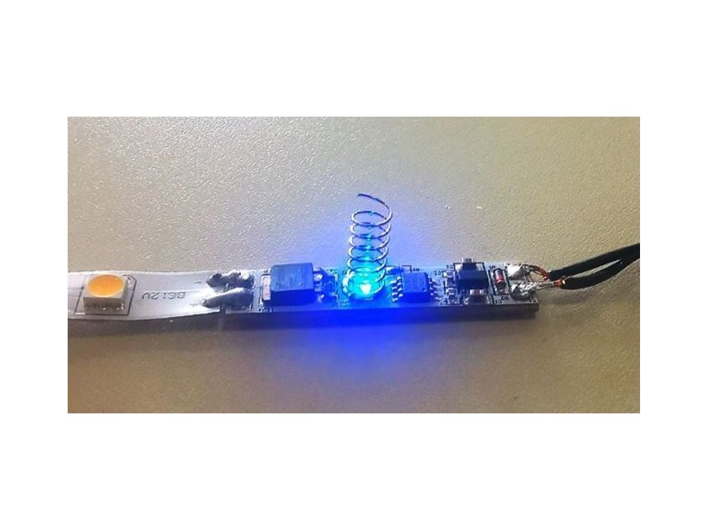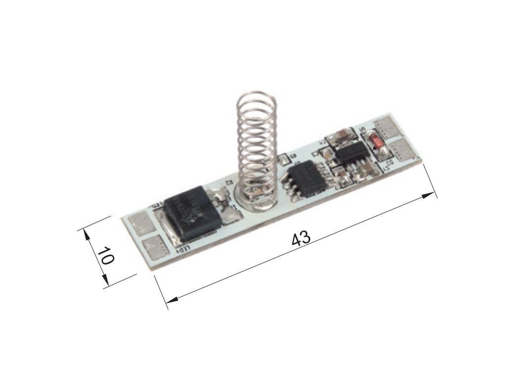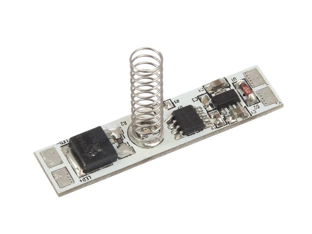 Senzor do ALU profilov. Slúži k ovládaniu LED pásiku, dotykom na svietiaci bod zapneme / vypneme ostvetlenie, dlhým dotykom je možné nastaviť intenzitu osvetlenia. Určené pre napätie 12 V / 24V DC (rovnakosmerné). Max. spínaný prúd 8A. Maximálny spínaný výkon: 96W (12V), 192W (24V). Pružinku skráťte podľa potreby tak , aby sa dotýkala krytky profilu. V prípade príliš dlhej pružinky môže dôjsť ku kontaktu s kontaktmi, profilom a pod., a tým k nefunkčnosti, prípadne i poškodeniu vypínača. Príliš skrátenú pružinku je možné opatrne roztiahnuť. Pozor na vytrhnutie, hrozí poškodenie, je nutná opatrná manipulácia. Zvlášť v prípade spínania vyšších výkonov musí vypínač priliehať k ALU profilu pre odvod tepla. Doporučujeme podlepenie obojstrannou lepiacou páskou 3M.