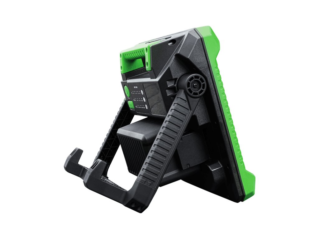 Kompaktný LED reflektor pre profesionálne použitie. Poskytuje rovnomerné a stabilné, smerové osvetlenie. Vyrobený z nárazuvzdorného polypropylénu (PP). Jeho menšia veľkosť a kompaktný dizajn uľahčujú prepravu. Je vybavený spínačom so 4-stupňovým nastavením svetelného výkonu. Dodatočné tlačidlo umožňuje nastaviť farbu svetla od 2700K do 6500K. Lampa je kompatibilná s 18V batériami od výrobcov ako Bosch (18V Professional), Milwaukee, Makita, DeWalt a Metabo. Zariadenie má displej zobrazujúci úroveň nabitia batérie. IP65 / IK08