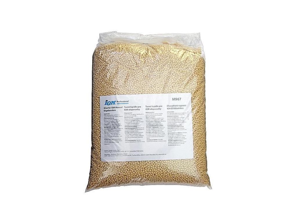 Špeciálne vyvinuté taviteľné lepidlo v granulách pre IGM manuálne olepovačky hrán. Je prírodnej farby, má nízku viskozitu, rýchle tavenie a vysokú lepivosť. Lepidlo je určené pre lepenie hrán materiálov ABS, PVC, PP, melamín, polyester alebo dyha. Odporúčame nastaviť teplotu na IGM olepovačke na hodnotu cca 140°C podľa teploty v dielni.