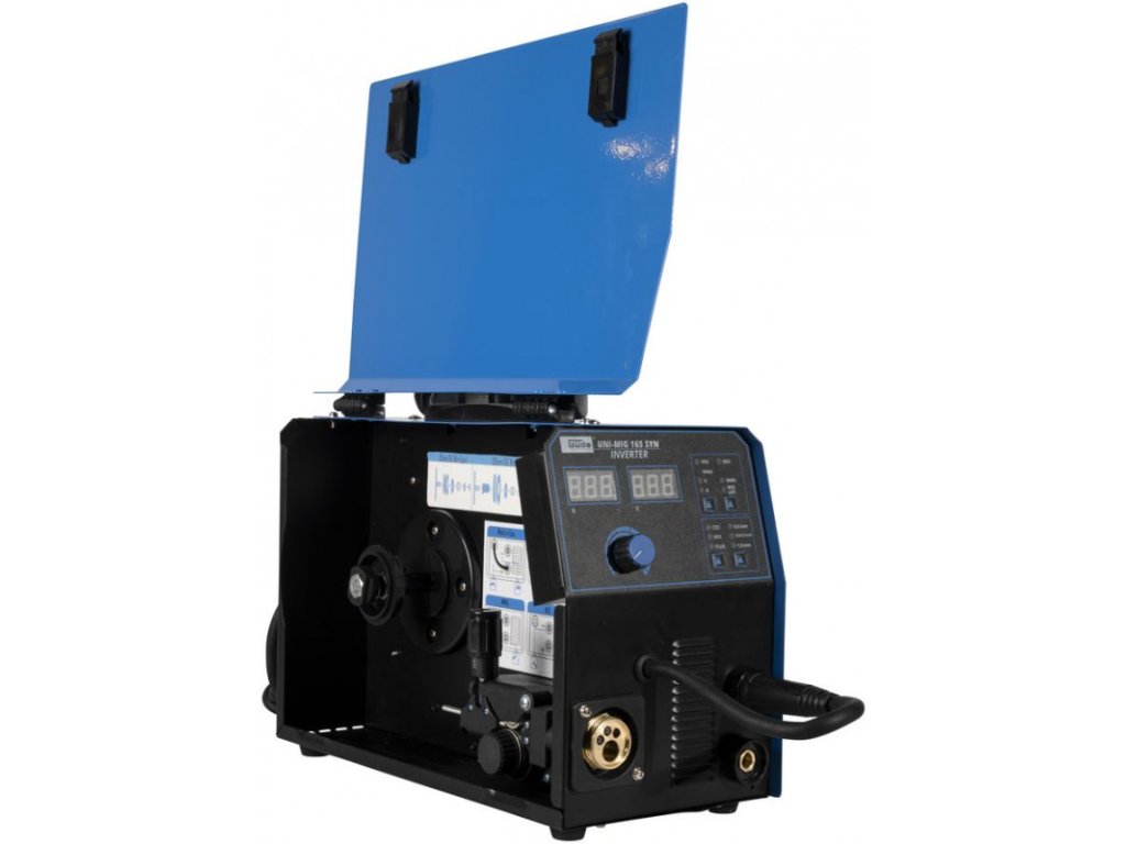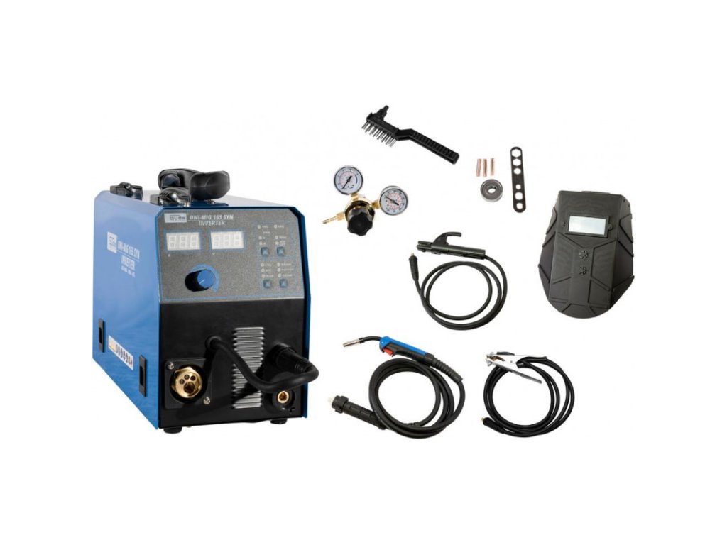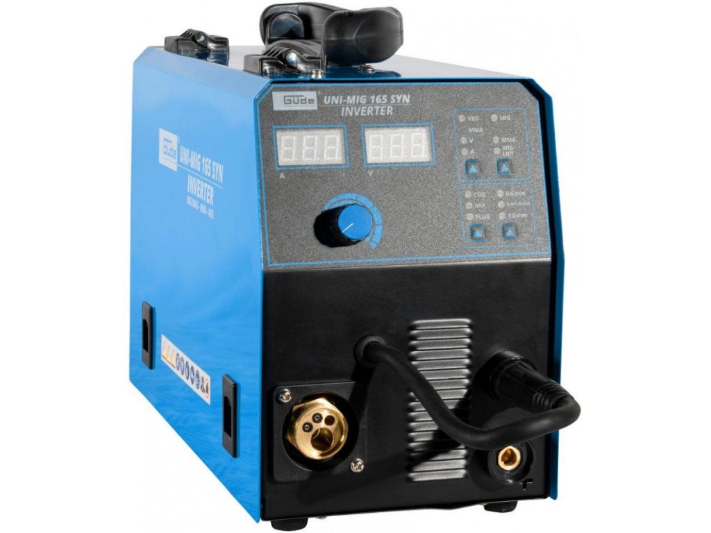 Invertorová zváračka Uni-Mig 165 SYN patrí medzi univerzálne invertorové zváračky v produktovom rade spoločnosti Güde. So zváračkou Uni-Mig 165 SYN sú možné prakticky všetky štyri zváracie procesy: MIG-MAG, MMA (zváranie elektródou), Flux (zváranie plneným drôtom), aj zváranie WIG (voliteľné). Osvedčené doplnkové vlastnosti ako Anti-Stick (zabraňuje prilepeniu elektródy k obrobku), Hot Start (pre optimálne zapaľovanie elektródy) a Arc Force (stabilizuje oblúk automatickým nastavením zváracieho prúdu a zaisťuje tak dokonalé výsledky zvárania) zaisťujú maximálny komfort pri zváraní, a to aj v náročných podmienkach. Nový, inovatívny synergicky regulovaný posuv drôtu sa po výbere procesu zvárania, hrúbky drôtu a sily zvárania automaticky nastaví na správnu rýchlosť. Tieto doplnkové funkcie umožňujú najmä začiatočníkom a neskúseným zváračom okamžite dosiahnuť dobré výsledky zvárania. Držiak elektród a ukostrovacia svorka, ako aj kladivo s kefou pre procesy MMA sú súčasťou štandardnej výbavy. To isté platí aj pre horák MIG/MAG a regulátor tlaku na ochranný plyn. Vhodná na malé cievky a plastové cievky D200 (5 kg). Kryt vyrobený z oceľového plechu s povrchovou úpravou práškovaním, tepelná ochrana proti preťaženiu. Trojmetrový hadicový zväzok s Euro prípojkou (MB15), 1,2-metrový uzemňovací kábel s ukostrovacou svorkou, 1,8-metrový držiak elektród. Prúdová tryska (0,8 mm), 1 plynová tryska. Dvojhodinový reduktor tlaku, plynová hadica. Vrátane zváračského štítu a kladiva na trosku s kefkou. Doba zapnutia pri maximálnom zváracom prúde 230 V (MMA/MIG/MAG/WIG): 30%.