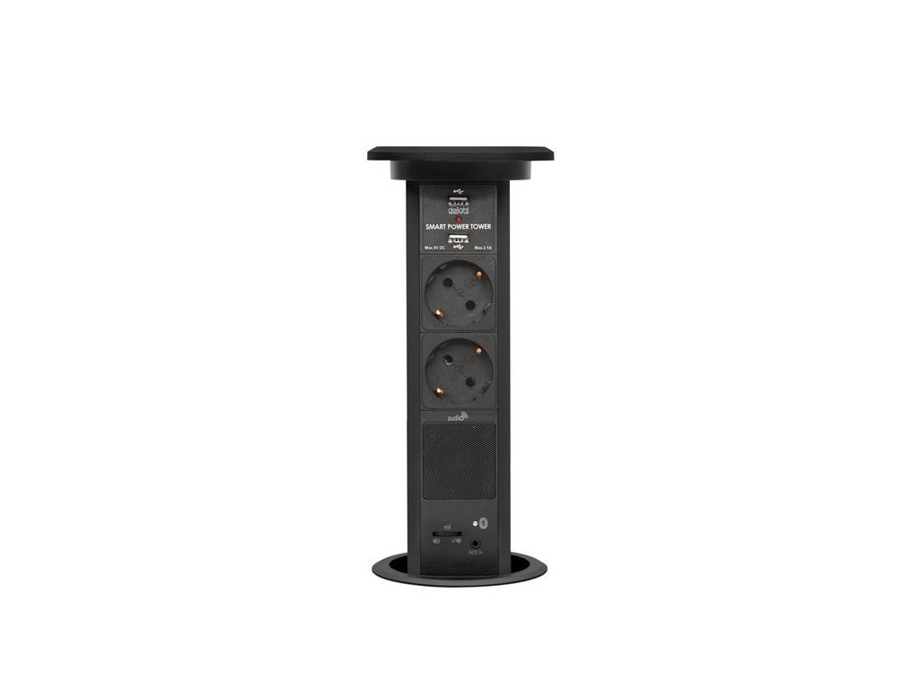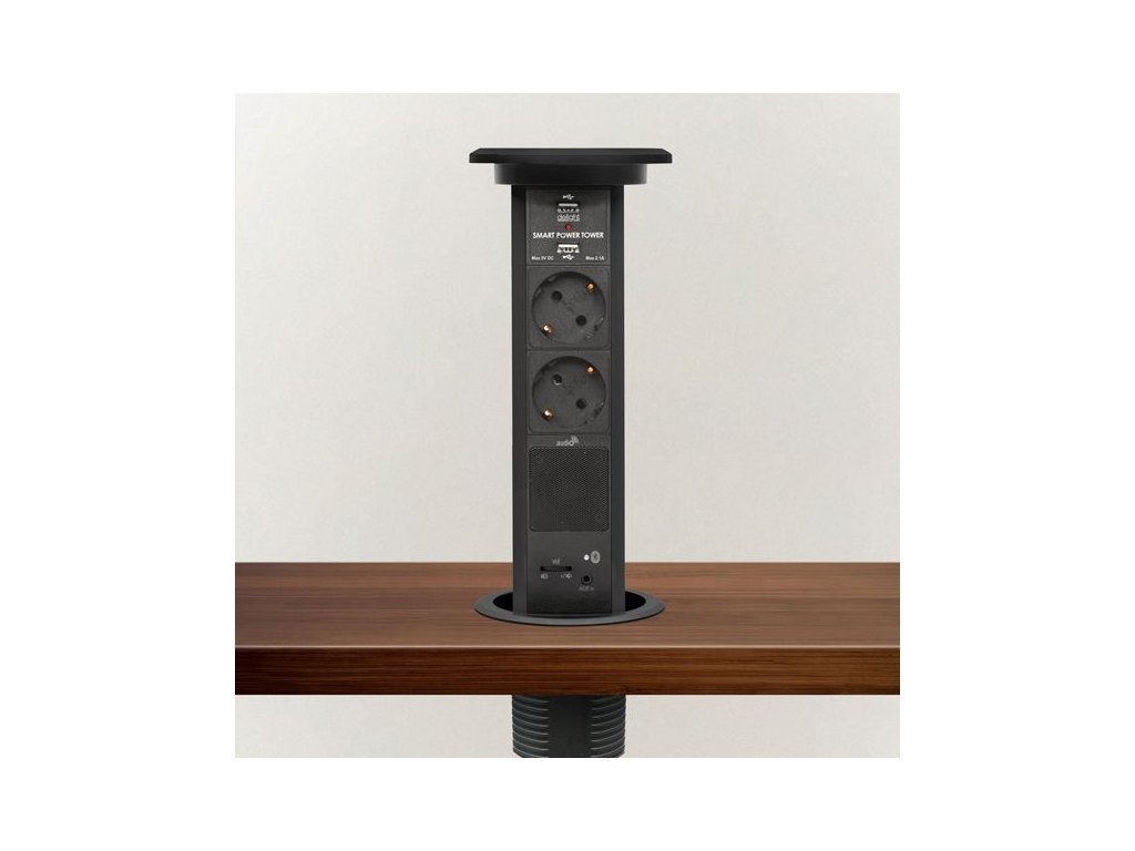 Skrytá predlžovačka poháňaná motorom vhodná do kancelárie aj do domácnosti s kovovým telom, s 2 zásuvkami s detskou ochranou a dvojtým USB nabíjacím portom , reproduktorom a možnosťou pripojenia cez bluetooth.Počúvajte hudbu napríklad vo vašej kuchyni alebo kancelárii pomocou vstavanej predlžovačky. Spárujte so svojim mobilným zariadením (podpora android, IOS ) alebo pripojte pomocou 3,5 mm AUX kábla.