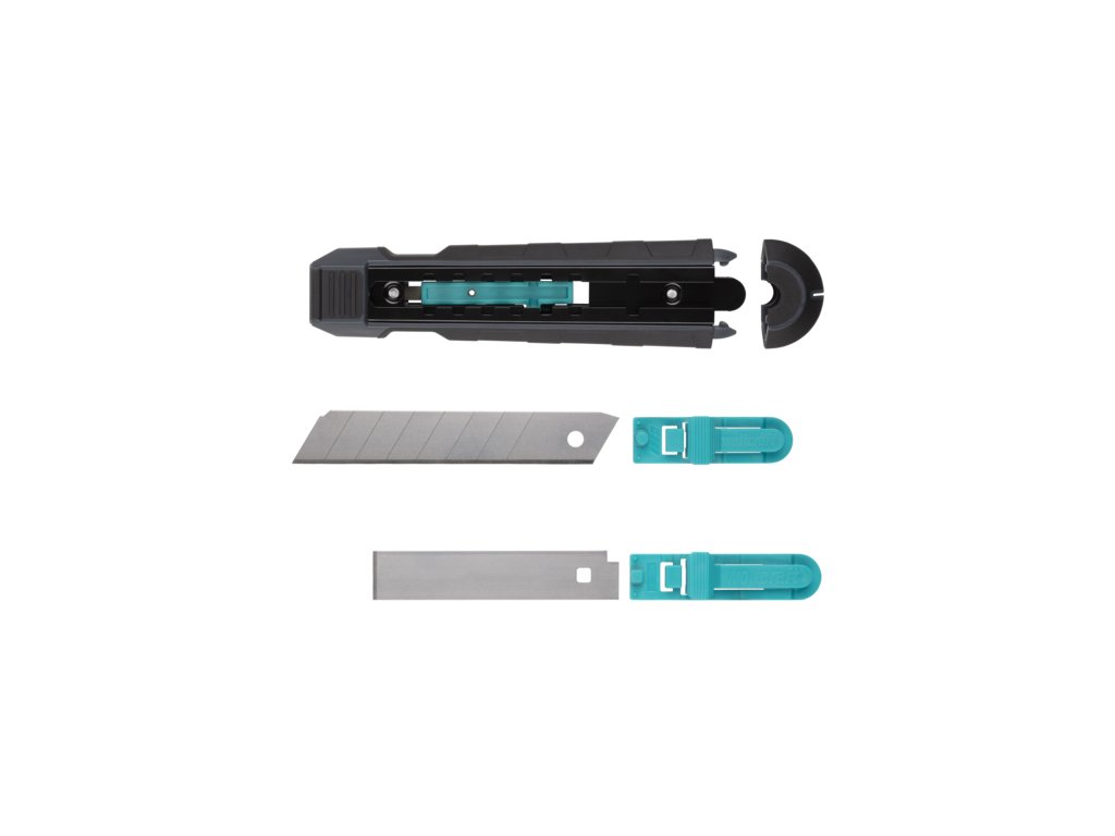 Kompatibilný s bežne predávanými 18 mm širokými odlamovacími nožmi a škrabacími nožmi od spoločnosti Wolfcraft (č. výr. 4311000)