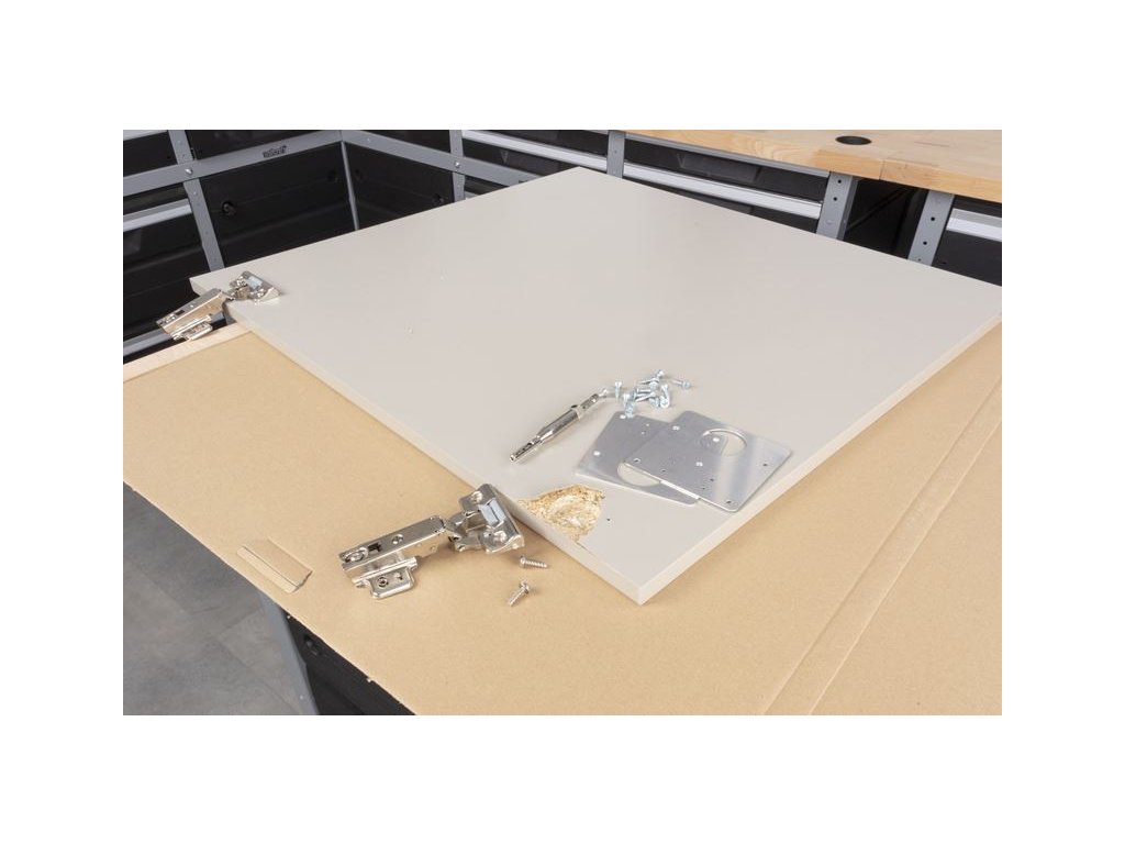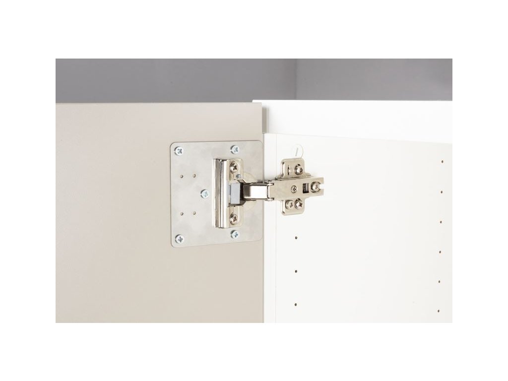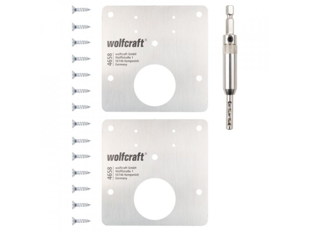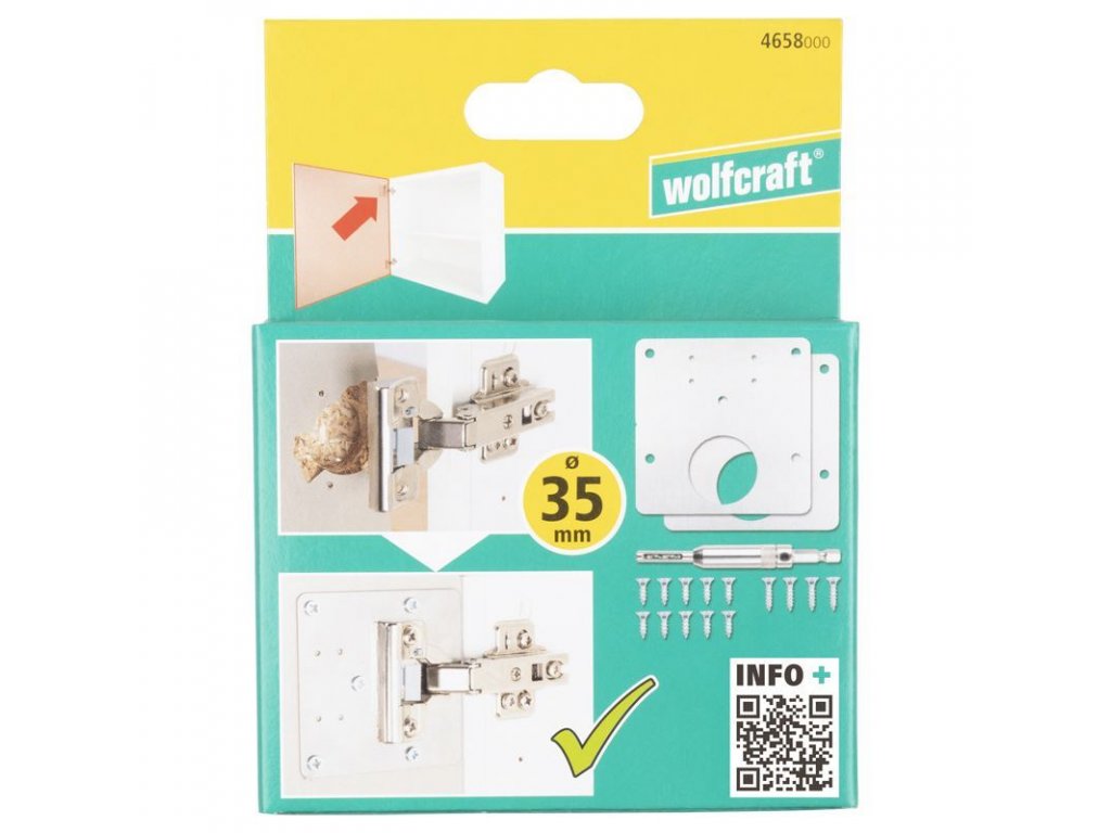 Umiestnite misku závesu do montážnej dosky a vložte ju do vytrhnutého otvoru na dverách. Pomocou samocentrovacieho vrtáka na závesy pripravte skrutkový spoj v 5 otvoroch pre skrutky v oceľovej doske. Nástroj zabezpečí presné dodržanie uhla 90° pri vertikálnom predvŕtavaní. Panel sa potom môže priskrutkovať na miesto. Po upevnení montážnej dosky pripravte závesný skrutkový spoj. Vložte samocentrovací vrták do otvorov pre závesné skrutky a predvŕtajte materiál dverí. Nakoniec nastavte posledné 2 skrutky a záves je opravený a funkčný.