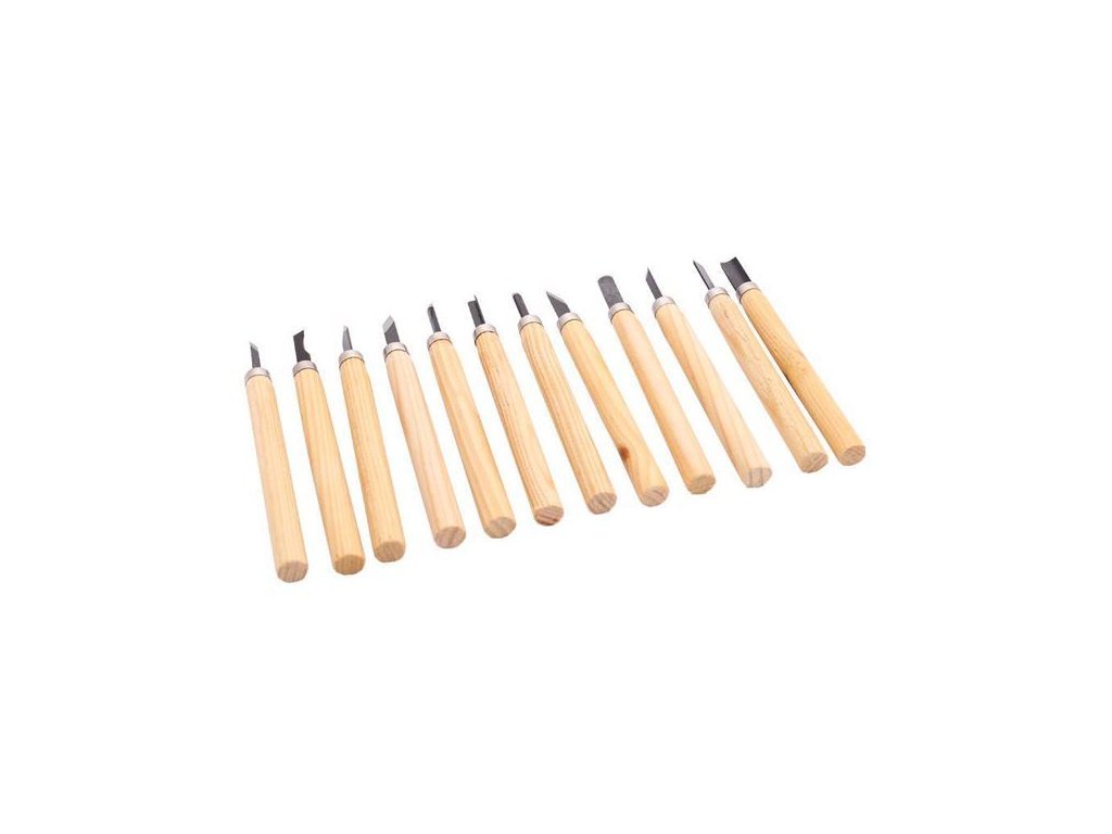 Sada 12 kusov dlát na drevo vybavených oceľovou čepeľou namontovanou na drevenej rukoväti. Perfektný nástroj na vyrezávanie do dreva, hliny, sadry alebo podobných mäkkých materiálov. Majú ergonomické rukoväte z lakovaného dreva, ktoré dobre padnú do ruky. Sú vyrobené z vysoko kvalitnej brúsenej ocele.