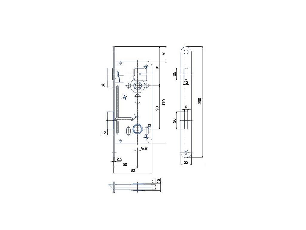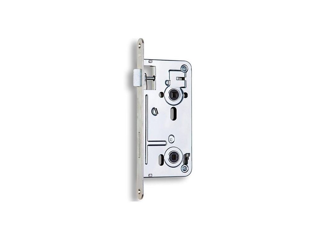 Obyčajný zádlabný zámok na WC bez prevodu. Jazýček zámku sa dá prispôsobiť na pravú aj ľavú stranu.