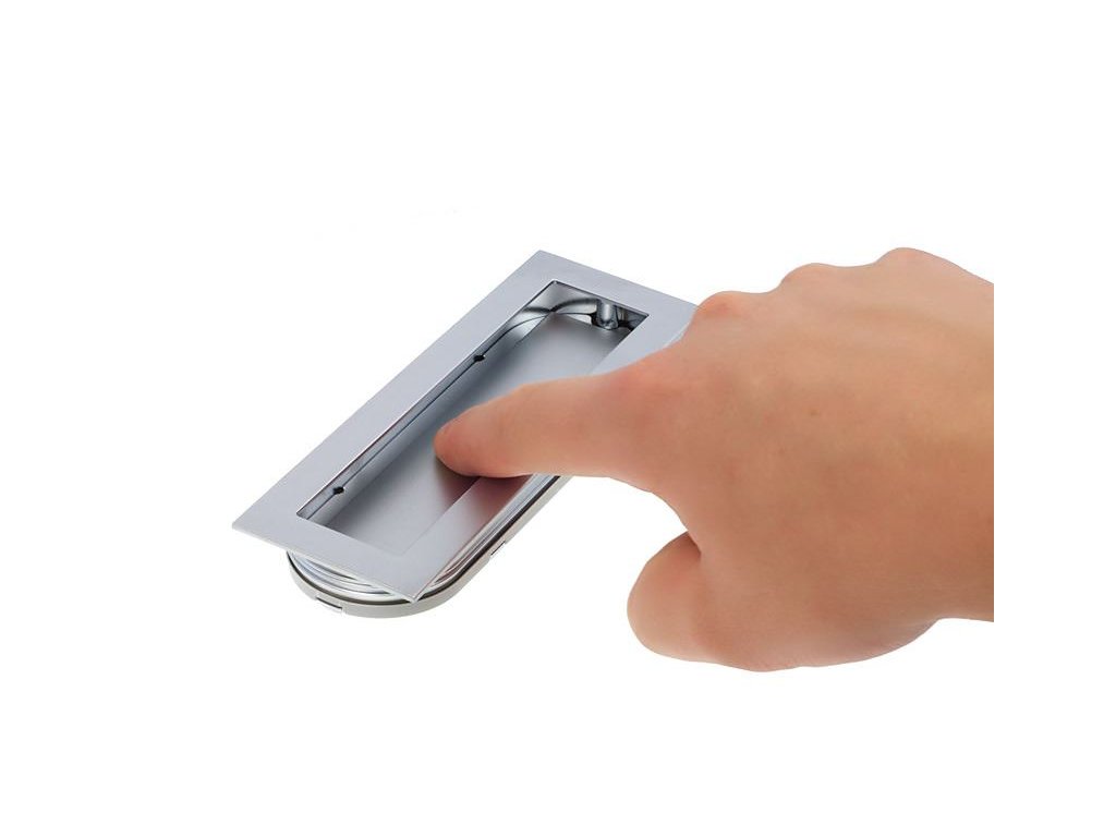 Plastová úchytka s povrchovou úpravou hliník. Otváranie pomocou zatlačenia do vnútra.